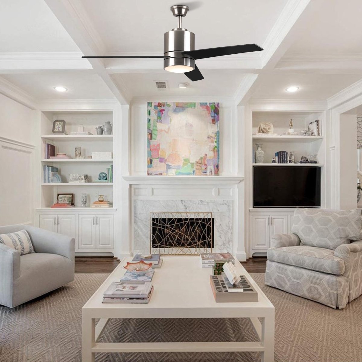 Furthermore, an LED light center is included in this fan with a 3000K color temperature with a warm white light. Plus, the lifespan of the fan is about 50,000 hours. So, it is a perfect option from a long-term perspective. Moving on, this smart ceiling fan is compatible with a remote control, Wi-Fi setting, and virtual home assistant. Therefore, this silver and black color fan will be an exquisite appliance for your living or workspace.