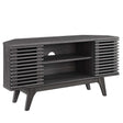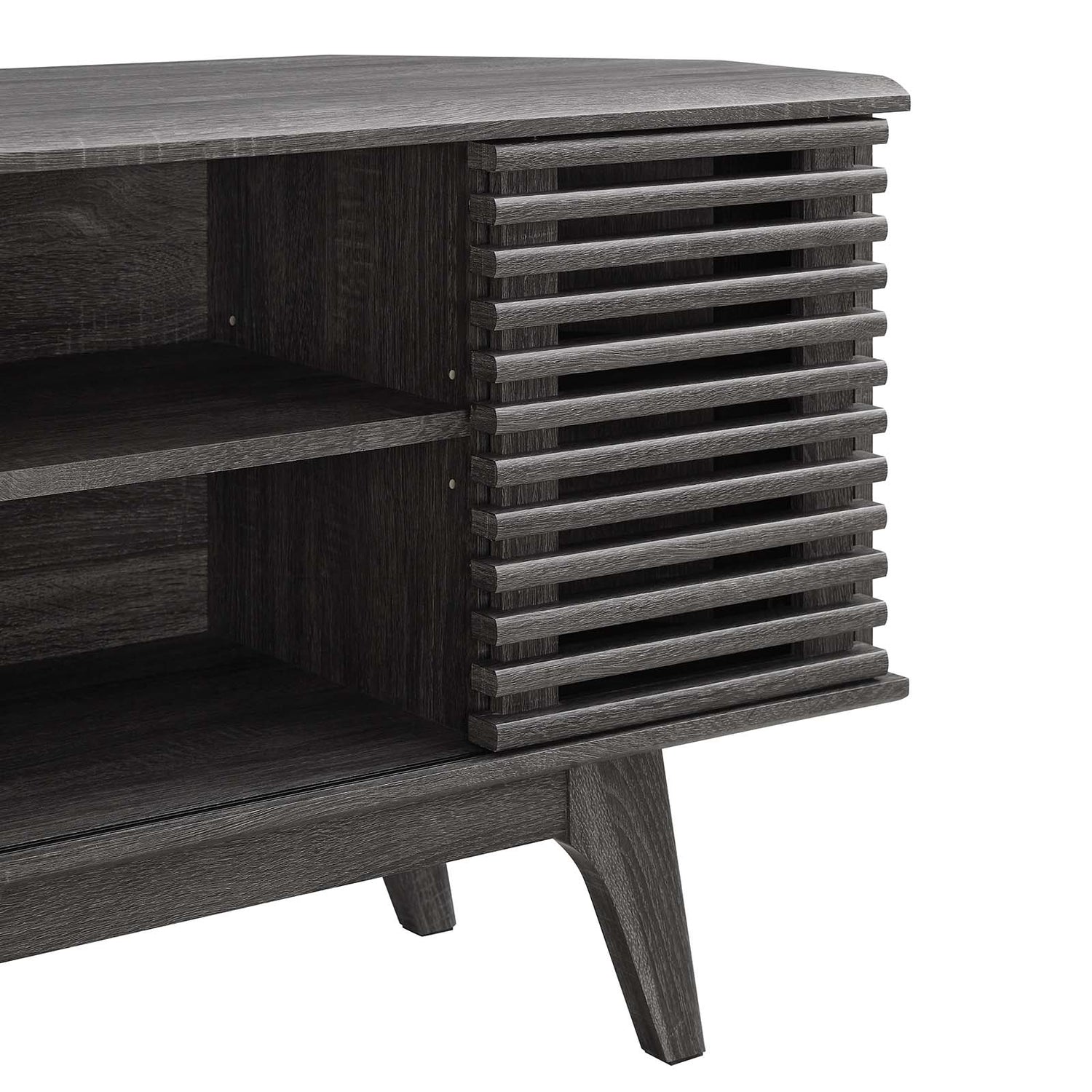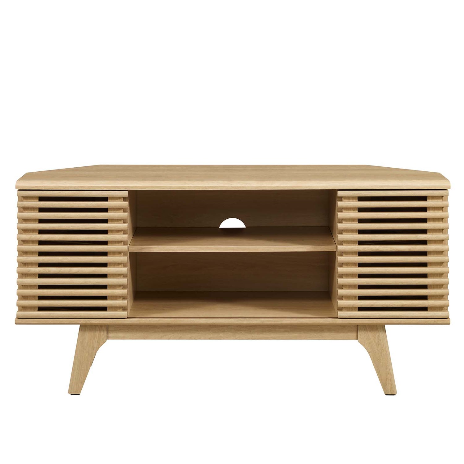 Tap into mid-century aesthetics with the Render 46” Corner TV Stand. Render features smooth walnut grain veneer, four solid wood tapered legs, non-marking foam foot pads, adjustable shelves, and two slatted sliding doors for sophisticated media storage. Complete with a cable management hole, Render’s contemporary linear style is the perfect addition to the modern living room, lounge, or recreation area. With slanted sides, this corner media stand accommodates TVs up to 50". Assembly required.