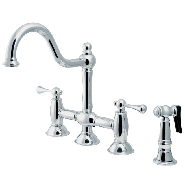 Restoration Bridge Kitchen Faucet With Brass Sprayer, Polished Chrome