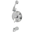 The traditional charm of this tub and shower faucet brings classical artistry to your home. Complete with an easy-to-turn lever Handle, an optimum bathing experience awaits. Enjoy the sturdy brass construction and premium polished chrome finish for a fixture that will last for years to come. A pressure balanced valve is included for safety and protection against accidental burns.