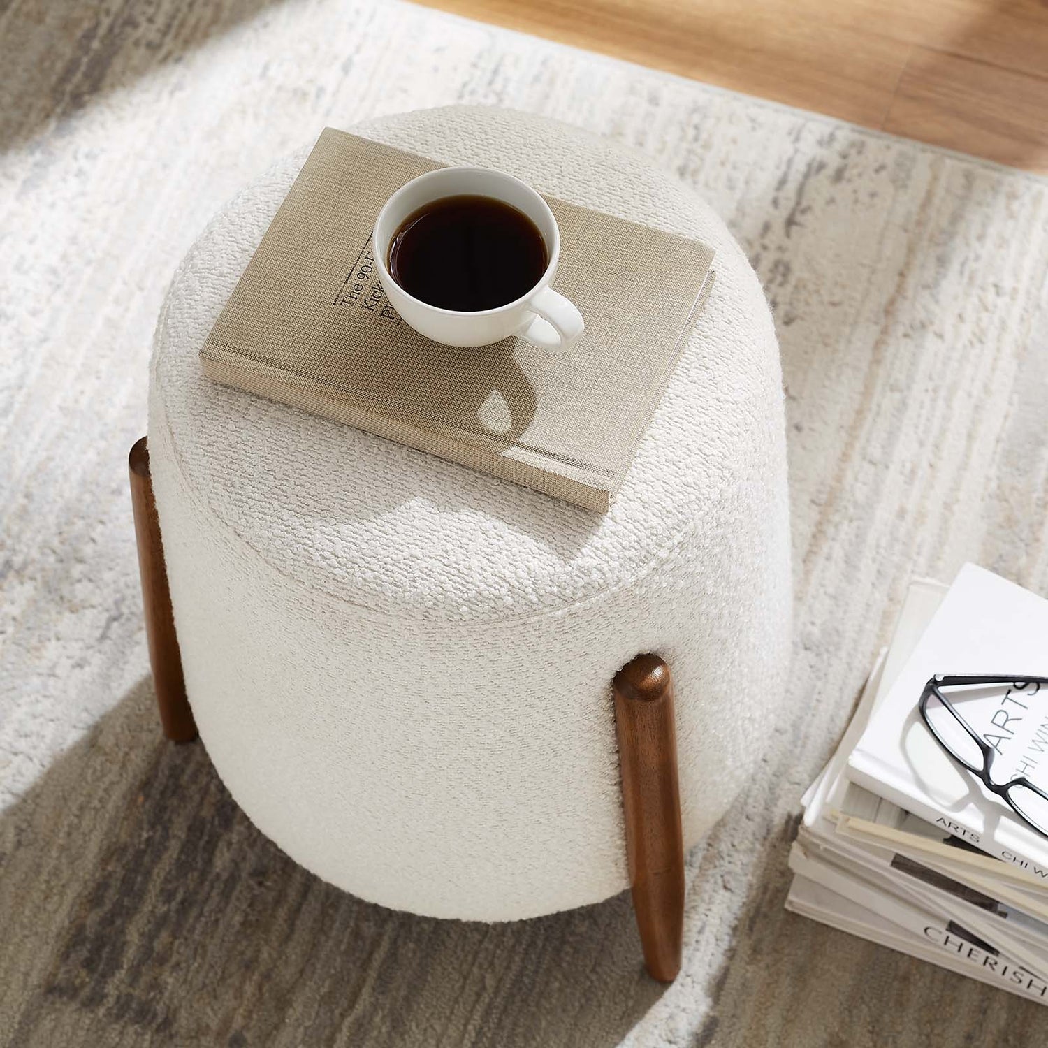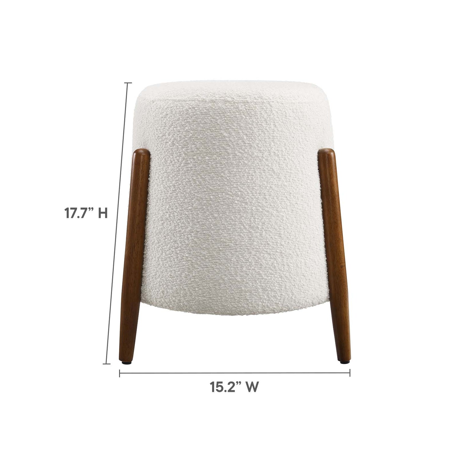 Immerse your living space in the sophisticated comfort of the Riven Ottoman. Upholstered in textured boucle fabric, this foam-padded, round ottoman stool radiates an air of elegance with a hint of modern panache. With its gentle curves and soft silhouette, this foot pouf ottoman stands on three tapered wood legs, elegantly affixed to the exterior of the footrest, providing a stable foundation while enhancing the piece’s overall shape with their sleek, splayed design. Whether it's accompanying your favorite armchair as a charming ottoman side table, used as an elegant vanity stool, or acting as a decorative ottoman in your living room, Riven's petite stature is designed to fit into any decor, offering a multifunctional ottoman for everyday needs. Celebrate the seamless blend of texture and form with this exquisite boucle ottoman, bound to become a cherished addition to your home furniture collection. Assembly Required. Weight Capacity: 264 lbs.