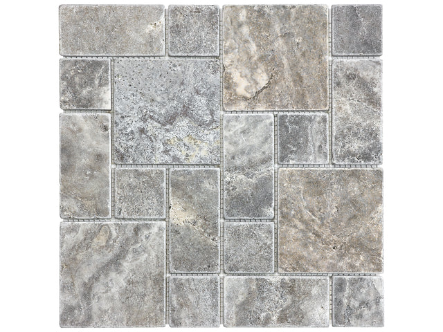 Roman Pattern Silver Ash Tumbled Travertine Mosaic
