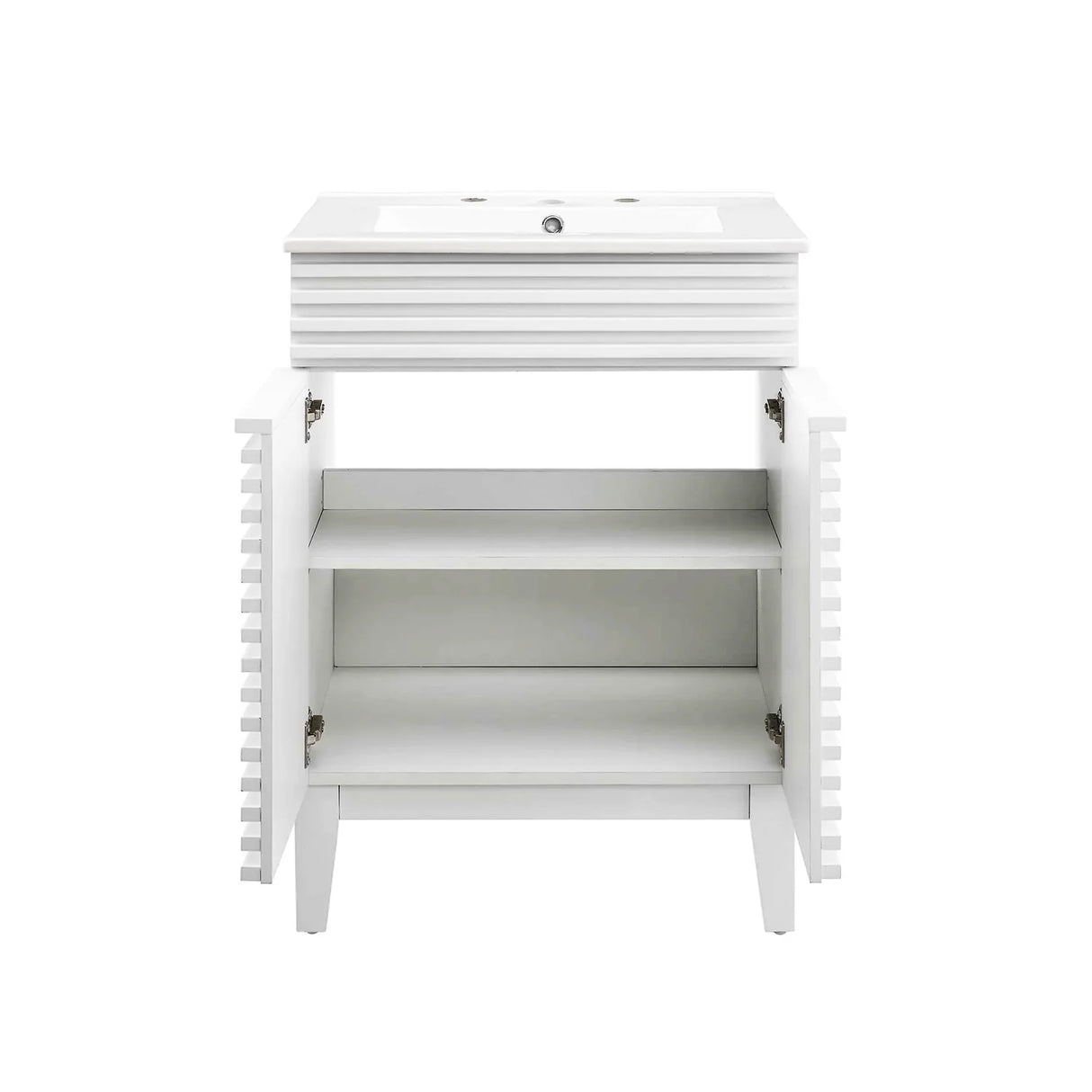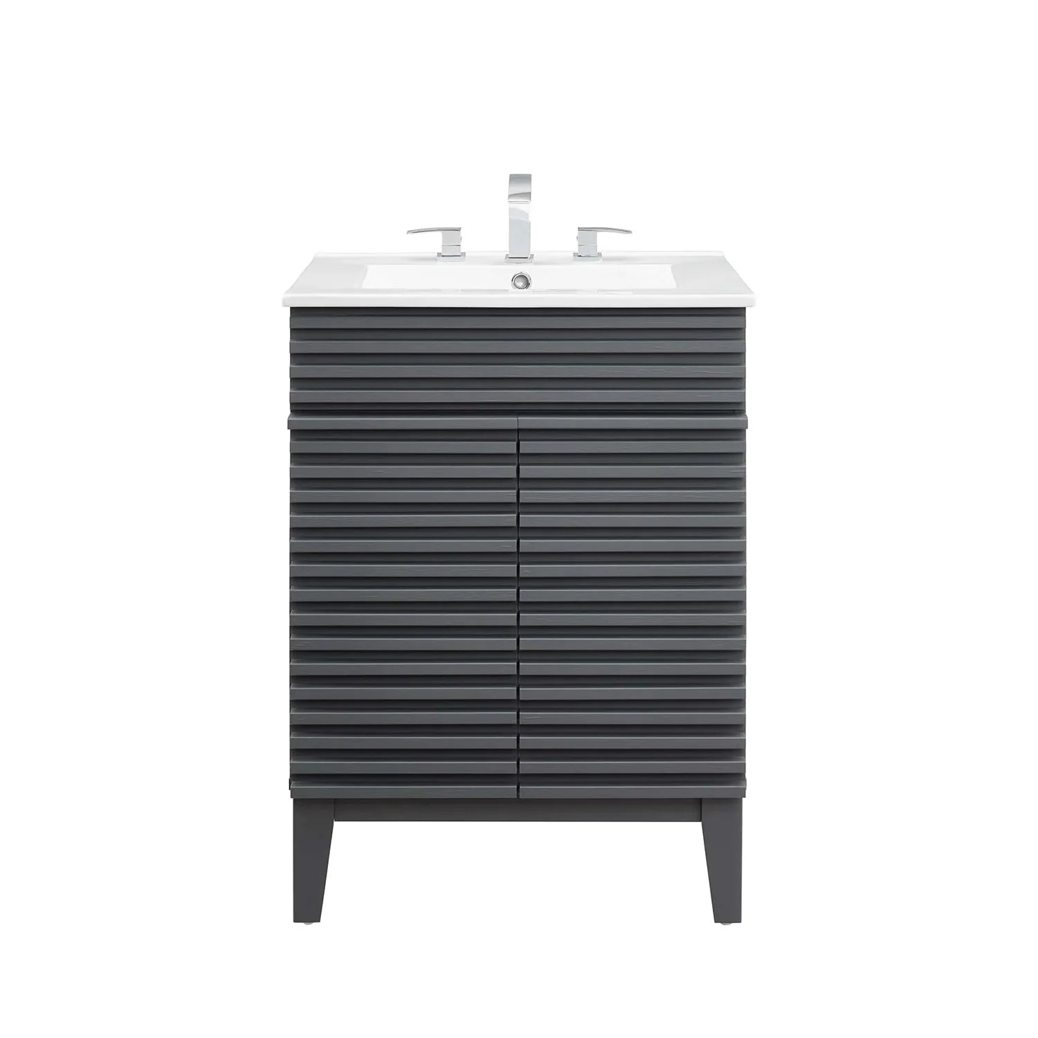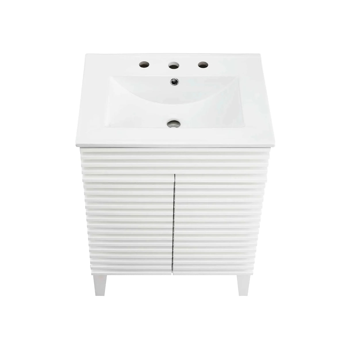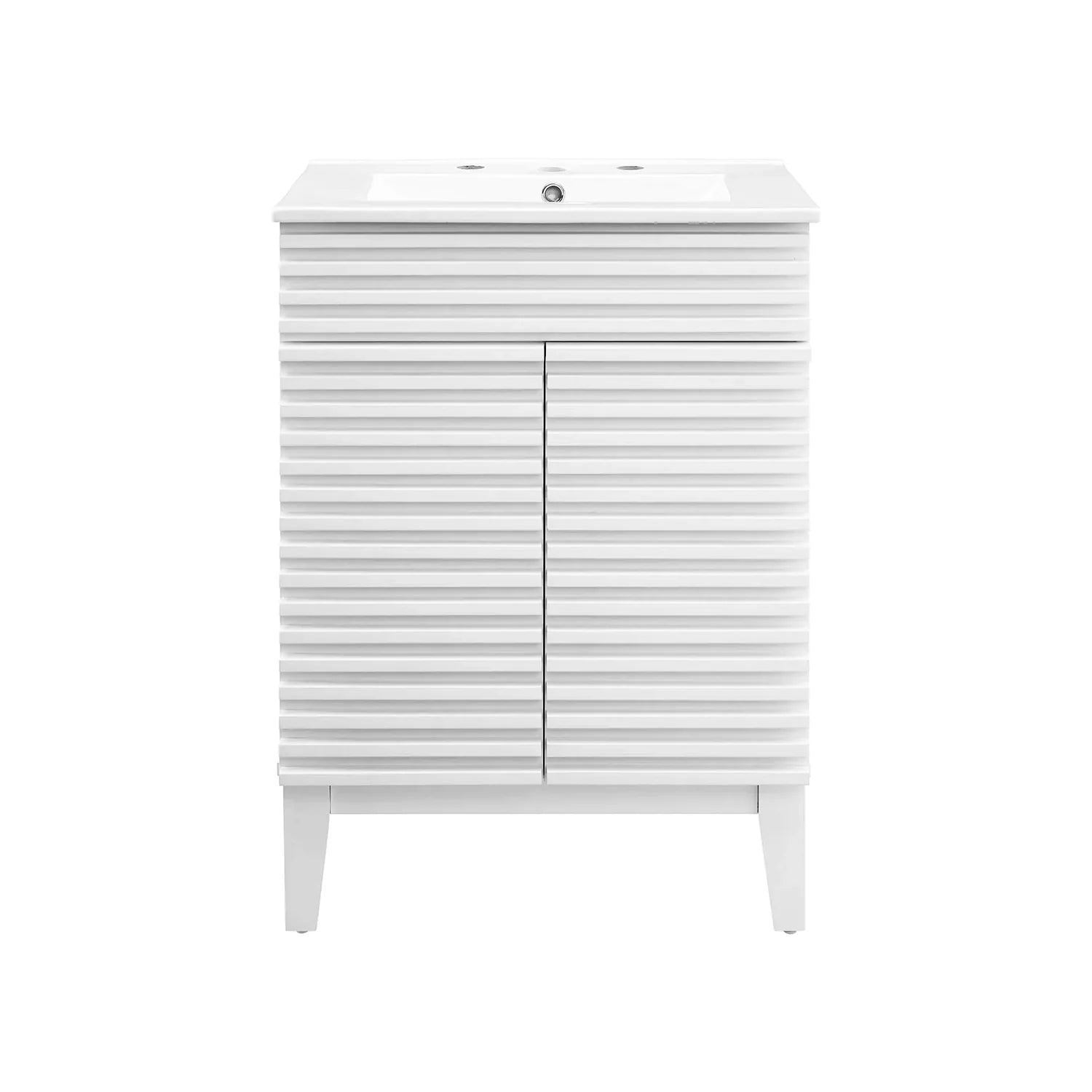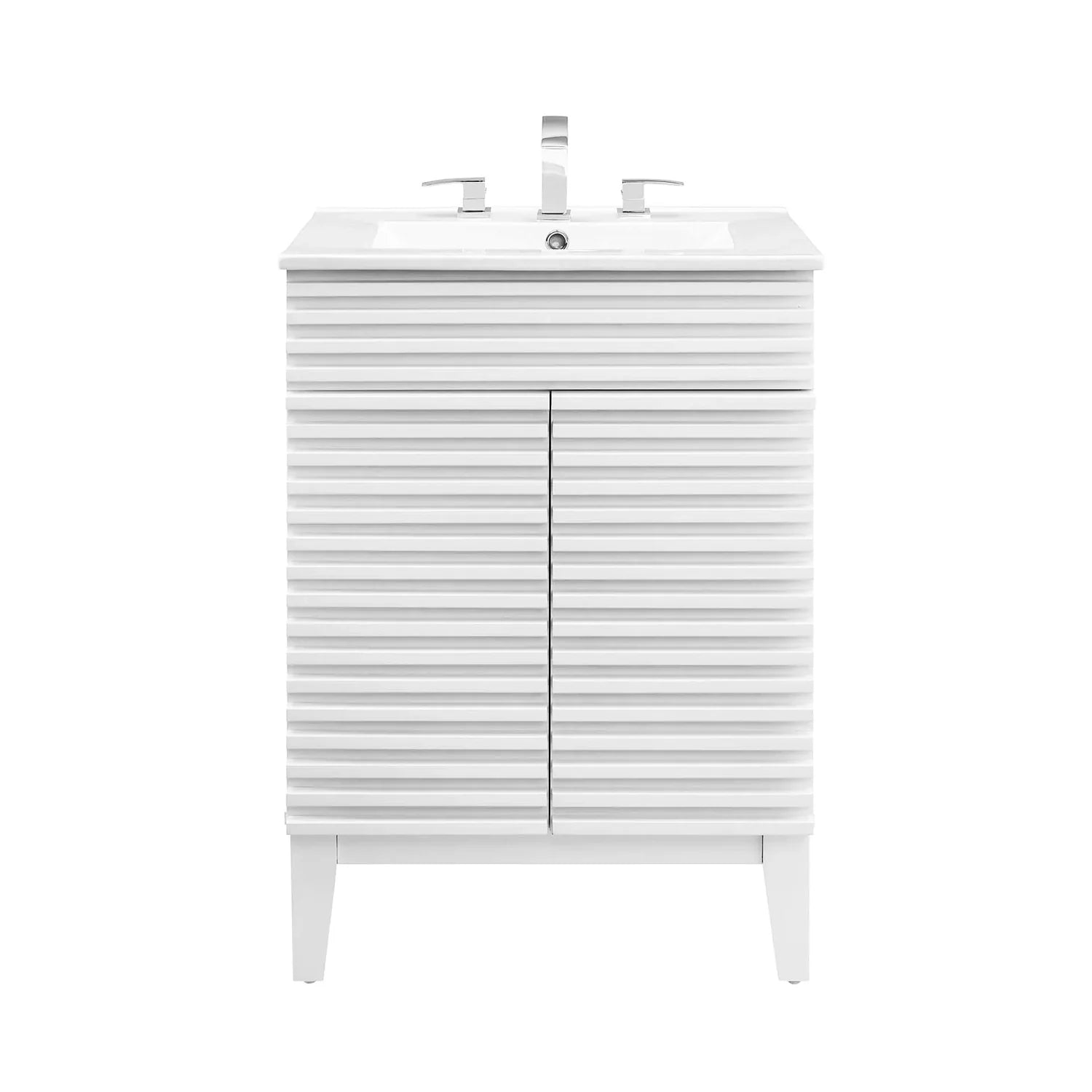 Upgrade your bathroom with the Rosie Freestanding 24 In. Bathroom Vanity. Featuring an integrated ceramic sink top, two doors, and adjustable storage shelves, this vanity seamlessly combines style and functionality. Its compact design is perfect for smaller spaces while providing ample storage for your essentials. The sleek and modern look, paired with practical storage solutions, makes it an ideal addition to any bathroom, enhancing both aesthetics and organization.