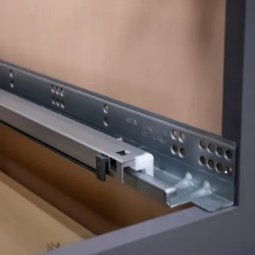 Drawer glides are all steel construction with an internal soft close mechanism on each glide for a smooth soft-closing motion.