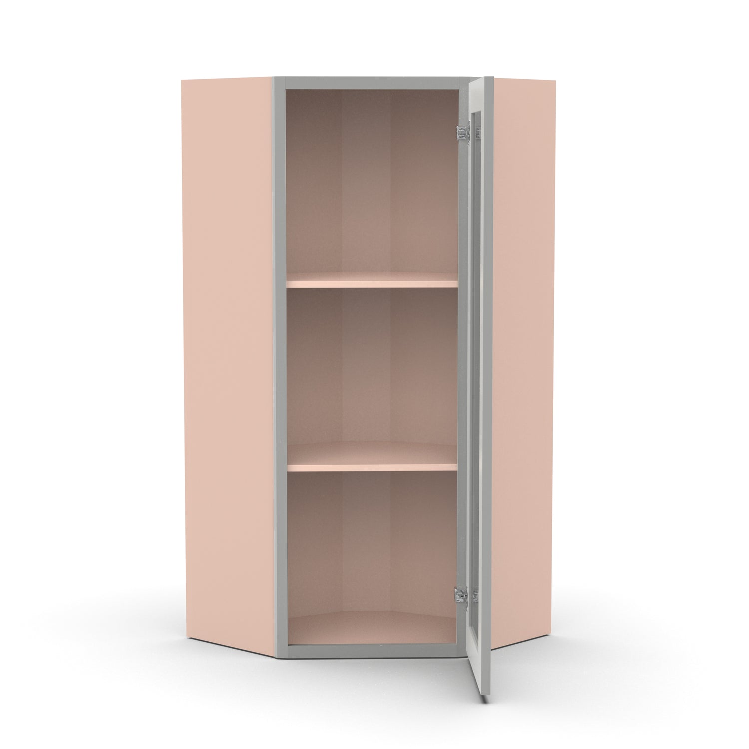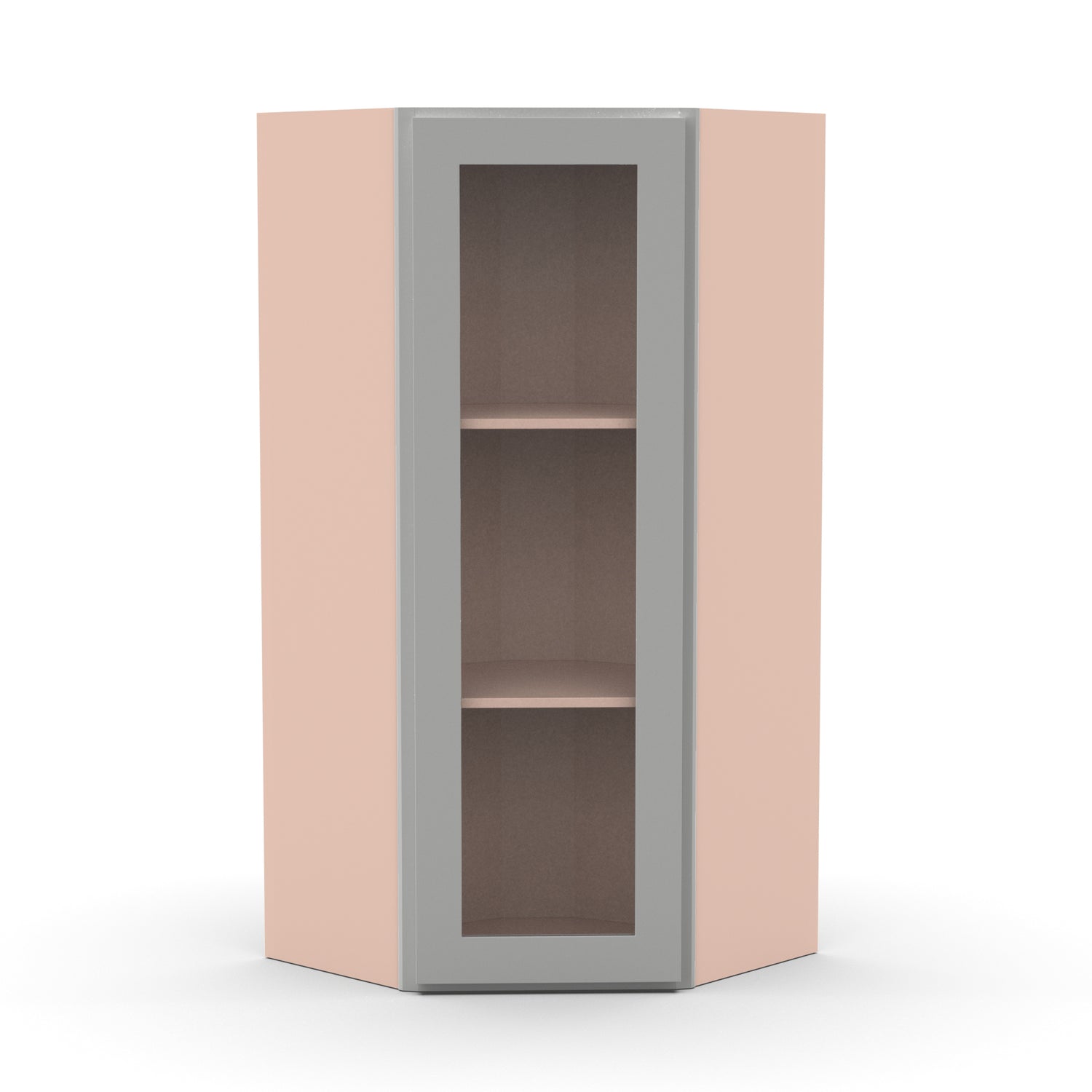Liberty Shaker Ashen - 24 Inch Diagonal Corner Glass Door Wall Cabinet - 24" Width x 36" Height x 12" Depth is backordered and will ship as soon as it is back in stock.