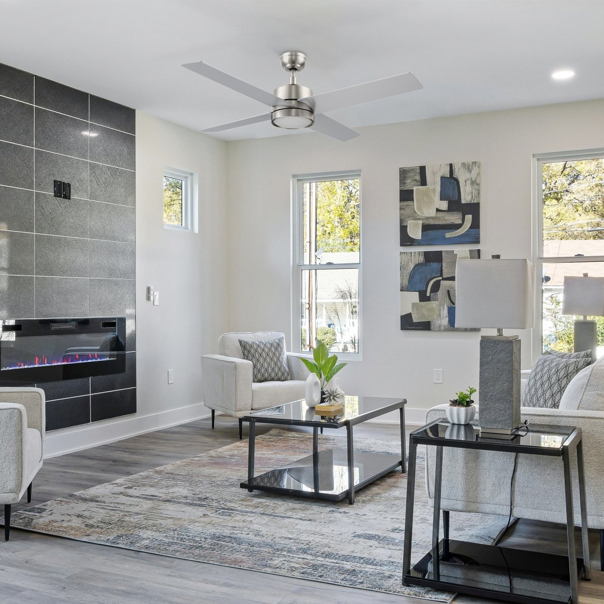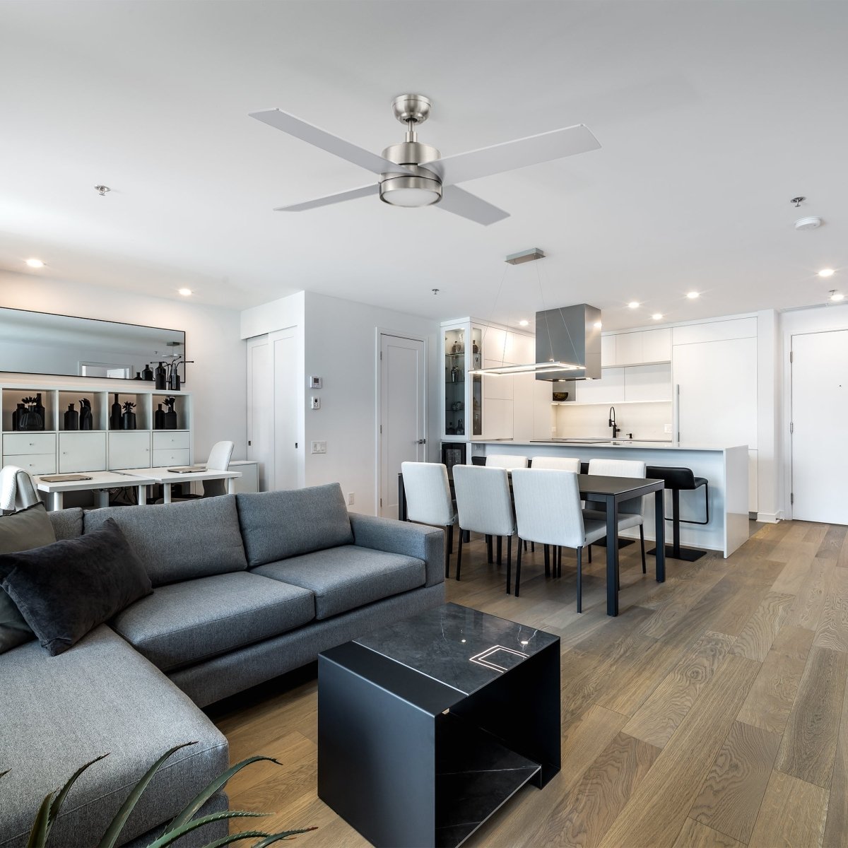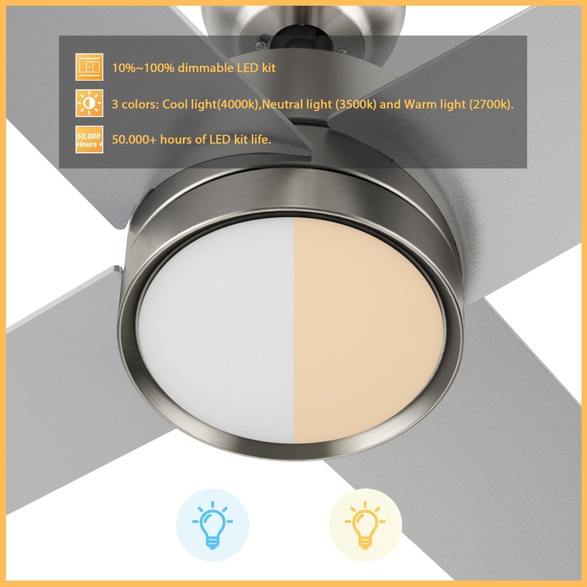 The 52" SANTANA ceiling fan comes with an efficient and quiet motor for large indoor and outdoor living areas that are ideal for this delicate modern masterpiece. The fan has a straightforward design with plywood blades, a 3500K LED light built in, and a sleek finish. The SANTANA ceiling fan control makes it simple to adjust lighting settings and fan speeds.