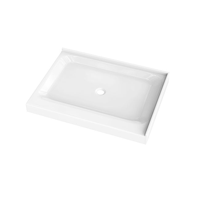 - 36 in. x 48 in. Double-Threshold Shower Base has a premium high-gloss, nonporous acrylic surface that is durable and easy to clean. This shower base offers strength with built-in, reinforced support and doesn't sacrifice style or design. It has a Center drain design and is the perfect size to convert an existing 48 in. x 36 in. bathtub into a shower. Exact dimensions: 48 in. W x 5.5 in. H x 36 in. D