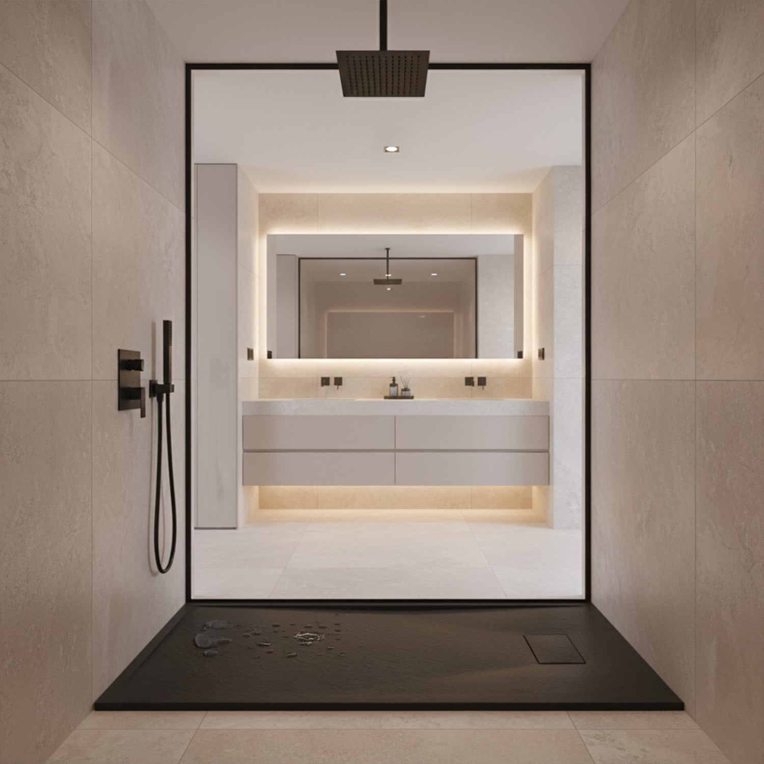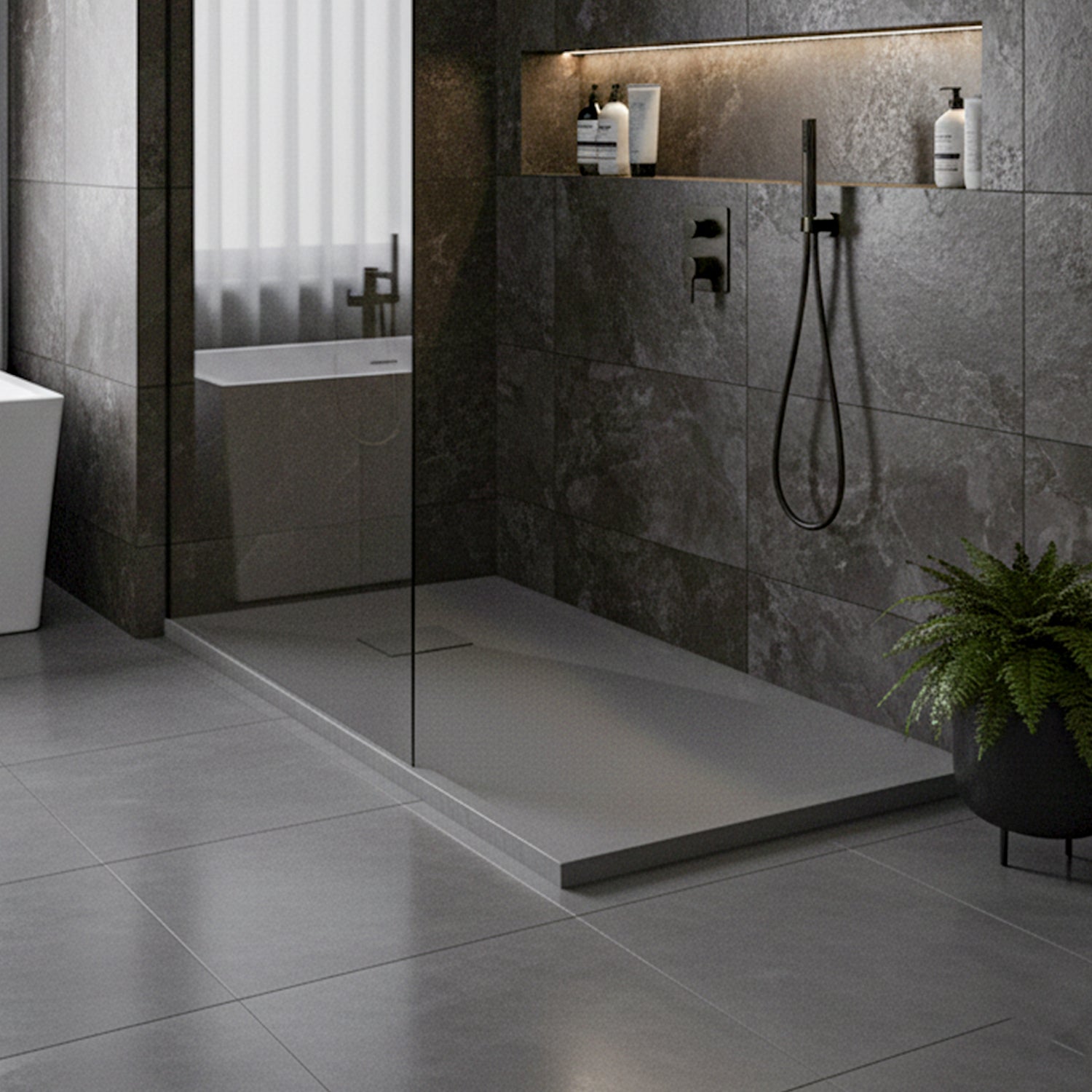- Integrated Drain Cover: An Integrated drain cover into the design of the tray, creates a shiny uniform appearance working towards preventing debris from entering and clogging the drain.