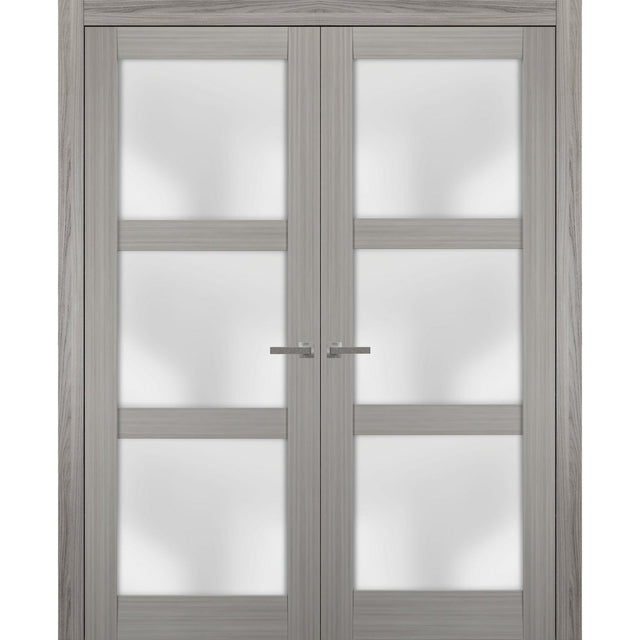 Solid French Double Doors | Lucia 2552 Grey Ash with Frosted Glass | Wood Solid Panel Frame Trims | Closet Bedroom Sturdy Doors