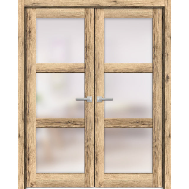Solid French Double Doors | Lucia 2552 Oak with Frosted Glass | Wood Solid Panel Frame Trims | Closet Bedroom Sturdy Doors