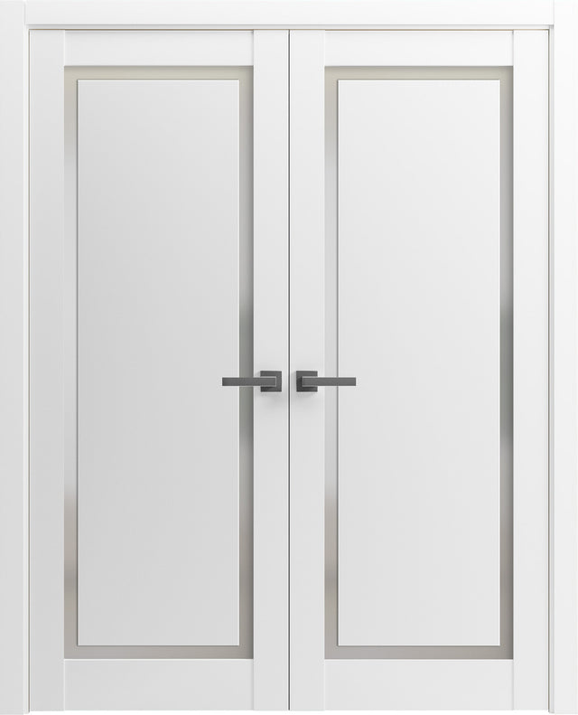 Solid French Double Doors | Planum 0888 Painted White with Frosted Glass | Wood Solid Panel Frame Trims | Closet Bedroom Sturdy Doors