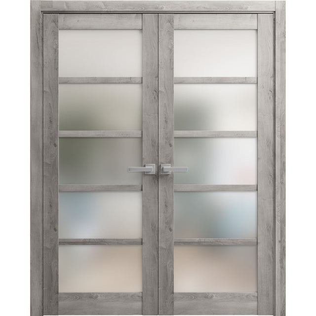 Solid French Double Doors | Quadro 4002 Nebraska Grey with Frosted Glass | Wood Solid Panel Frame Trims | Closet Bedroom Sturdy Doors