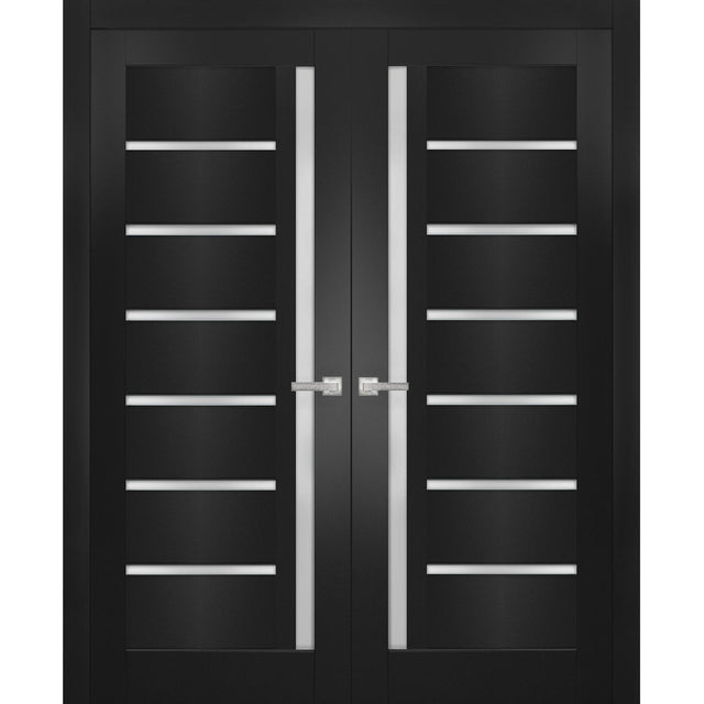 Solid French Double Doors | Quadro 4088 Matte Black with Frosted Glass | Wood Solid Panel Frame Trims | Closet Bedroom Sturdy Doors