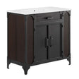 Experience the perfect blend of functionality and industrial modern style with the Steamforge 36" Bathroom Vanity. Crafted from sturdy metal with an antique patina and MDF with a beautiful wood grain veneer, this bathroom vanity cabinet brings a touch of utilitarian elegance to your bathroom decor. With a fixed drawer, pivot hinges on the double doors, and spacious shelving complete with a plumbing cutout, this vanity provides ample storage space for all your bathroom essentials. The ceramic sink basin boasts an integrated countertop with 8" centerset holes, ready for your chosen fixtures (not included). With non-marking foot pads to protect your flooring, this bathroom vanity offers the ideal balance of design and practicality.