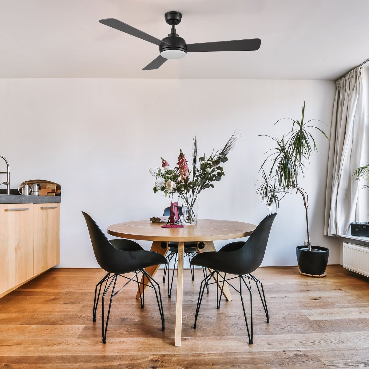 With an efficient and quiet motor, this 52" ceiling fan comes with a remote control and light kit. Your living area will remain cool, bright, and stylish with Tryton. Large indoor living areas are ideal for this delicate modern masterpiece. The fan has a straightforward design with plywood blades, a 3500K LED light built in, and a sleek finish.