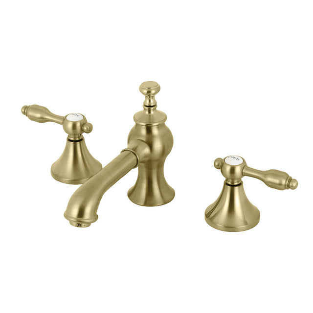 Offering a nod toward the past, this faucet is beautifully inspired by the vintage elegance of mid-19th Century design. Ideal for more spacious bathrooms, widespread faucets are more spread apart and feature a 3-hole installation. The Tudor 8-inch widespread bathroom faucet with brass pop-up and its featured sturdy brass construction and premium brushed brass finish are guaranteed to glamorize your home's traditional ensemble for years to come. A unique and classically enchanting personality is embodied in this centerpiece. A matching finish drain is also included.