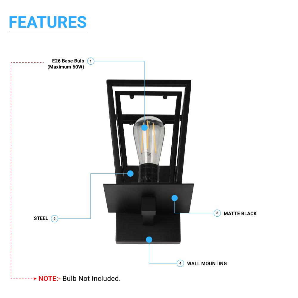 Enjoy the light and rustic charm of this 1-light wall sconce from our collection of timeless indoor decor lighting fixtures. The light offers a balance between traditional design and modern aesthetics, making it a suitable choice for both homes and office spaces. This indoor lighting fixture does not come with a pre-installed light bulb, so you can choose to fix any bulb that comes with an E26-style base. It comes with a robust steel body and features a matte black finish. It will blend with and adorn various indoor spaces like kitchens, guest rooms, living rooms, bedrooms, and offices. However, if you are looking for something more delicious, feel free to explore our collection of decor lights.
