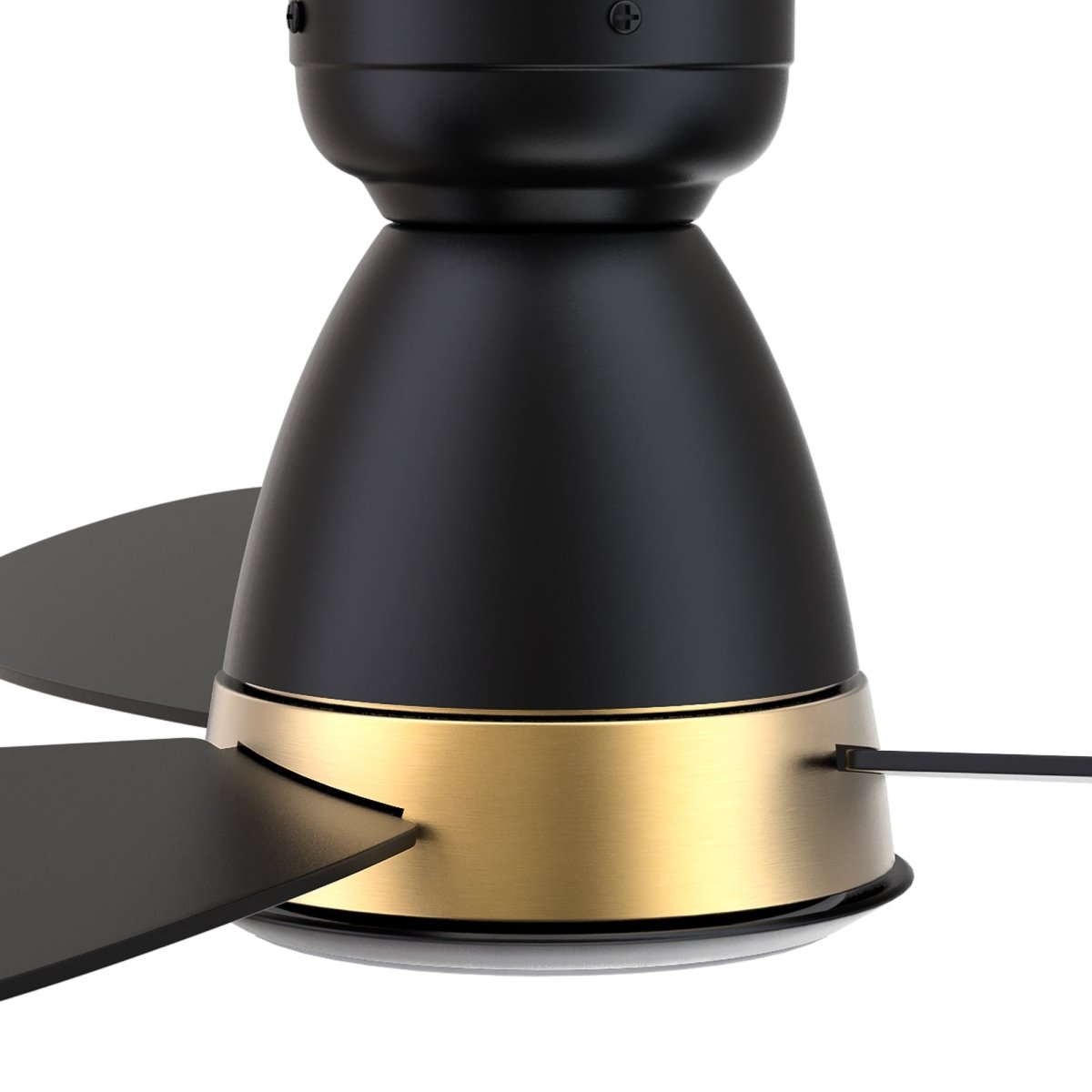 York 52'' smart ceiling fan adds style to your home and optimized energy efficiency. This Wi-Fi enabled smart ceiling fan is designed elegantly with a matte black motor hub, jet black finish fan blades, and gold band on the motor hub that adds sophistication to any decor. This fan has a low profile design, installing flush onto a ceiling. The height is only 7.9" from ceiling to blades and 11.3" from ceiling to bottom of light shade. It has an integrated 4000K LED light kit. The fan comes with a hand-held remote control, Wi-Fi Apps, Siri Shortcuts, and Voice control technology (compatible with Amazon Alexa and Google Home Assistant) to set fan preferences.