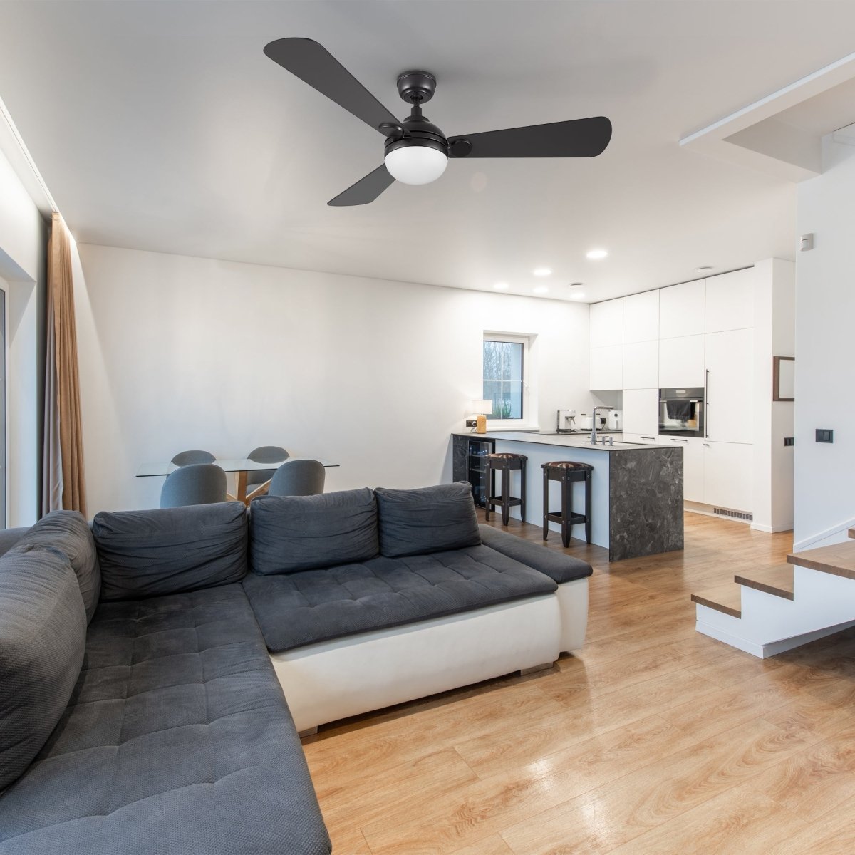 With an efficient and quiet motor, this 52" ceiling fan comes with a remote control and light kit. Your living area will remain cool, bright, and stylish with Zephyr. Large indoor living areas are ideal for this delicate modern masterpiece. The fan has a straightforward design with plywood blades, a 3500K LED light built in, and a sleek finish.