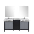 Zilara 72" Black and Grey Double Vanity, Castle Grey Marble Tops, White Square Sinks, Cascata Nera Matte Black Faucet Set, and 28" Frameless Mirrors