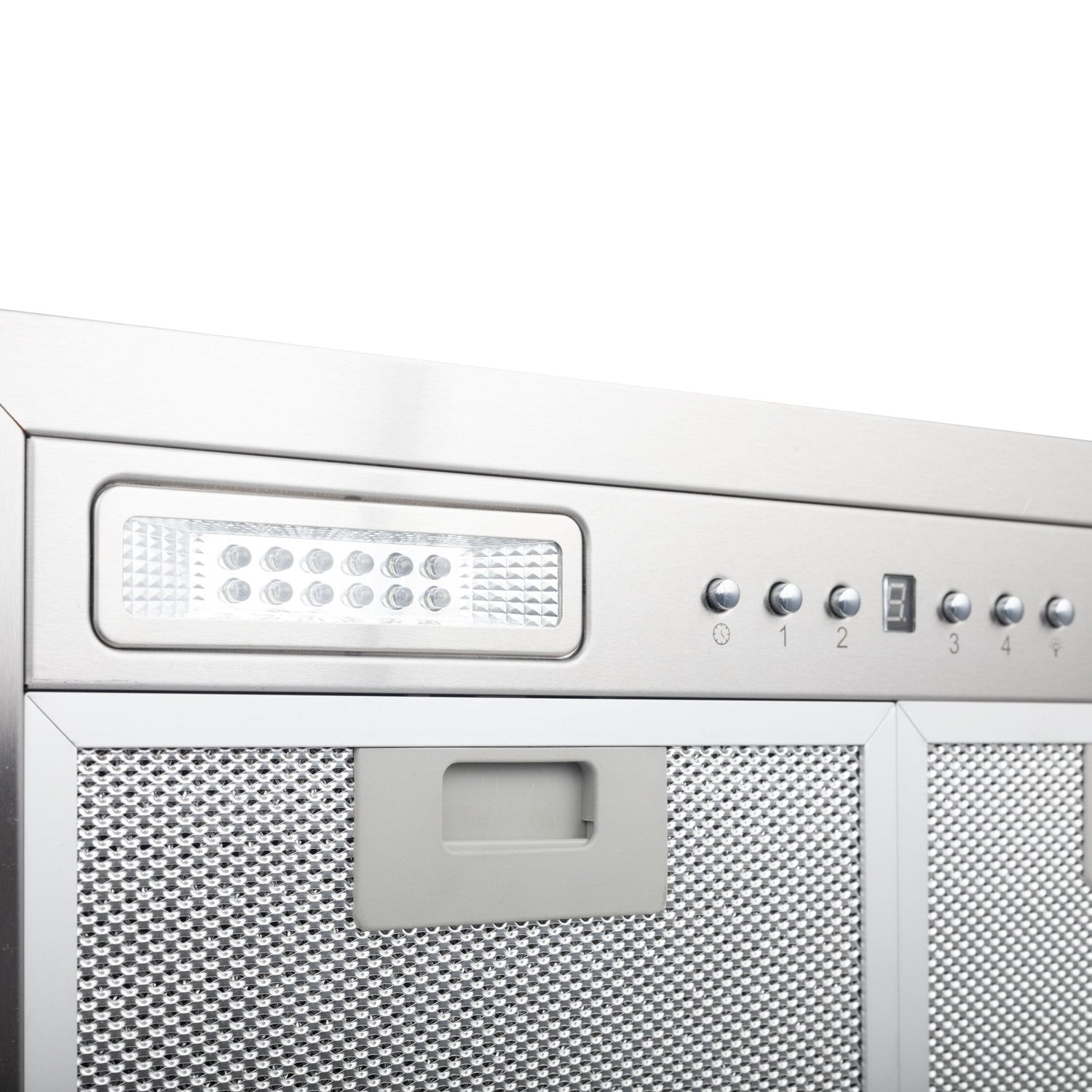 - LED lighting illuminates the cooktop beneath the hood