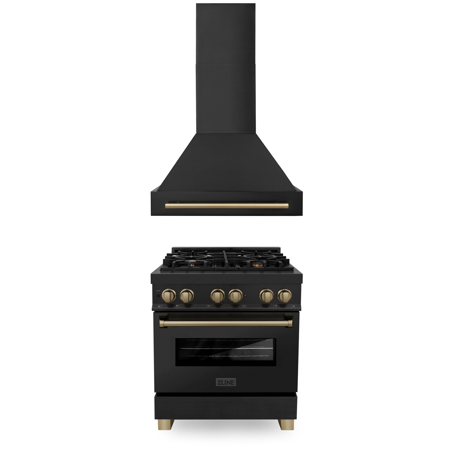 Shop Attainable Luxury with the ZLINE Kitchen and Bath Kitchen Appliance Package - featuring ZLINE Autograph Edition 30" 6.0 cu. ft. Dual Fuel Range with Gas Stove and Electric Oven in Black Stainless Steel with Champagne Bronze Accents (RABZ-30-CB)and ZLINE 30" Black Stainless Steel Range Hood with Champagne Bronze Accent Handle (BS655Z-30-CB). Save more on your dream kitchen when you bundle. Free shipping on all orders.