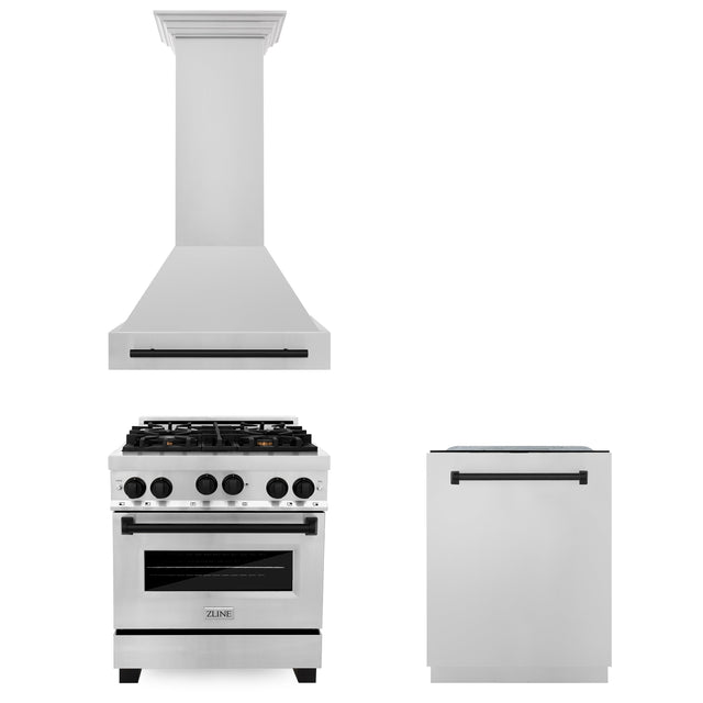 ZLINE 30" Autograph Edition Kitchen Package with Stainless Steel Gas Range, Range Hood and Dishwasher with Matte Black Accents (3AKP-RGRHDWM30-MB)