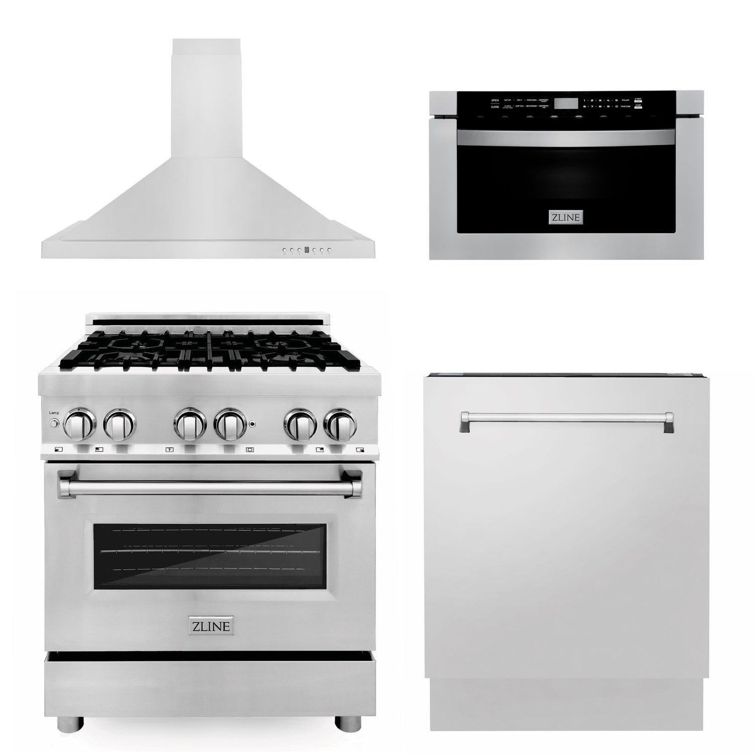ZLINE 30 in. Kitchen Package with Stainless Steel Dual Fuel Range, Range Hood, Microwave Drawer and Tall Tub Dishwasher (4KP-RARH30-MWDWV)