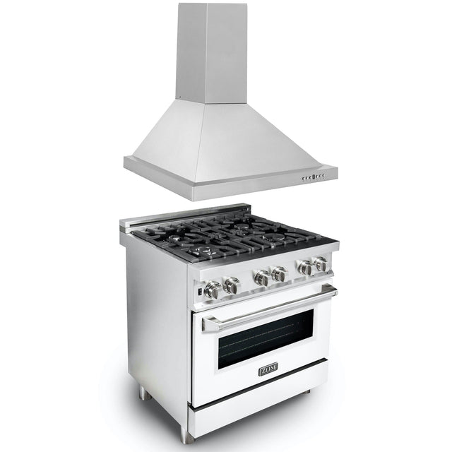 ZLINE 30 in. Kitchen Package with Stainless Steel Dual Fuel Range with White Matte Door and Convertible Vent Range Hood (2KP-RAWMRH30)