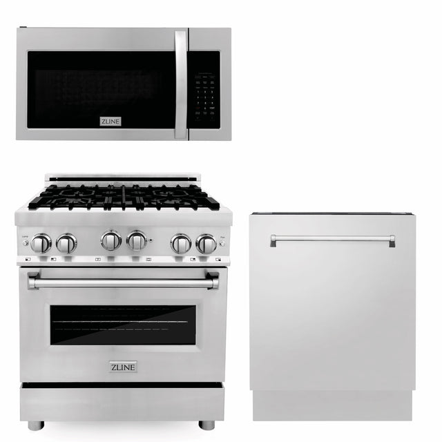 ZLINE 30 in. Kitchen Package with Stainless Steel Gas Range, Modern Over The Range Microwave and Tall Tub Dishwasher (3KP-RGOTR30-DWV)