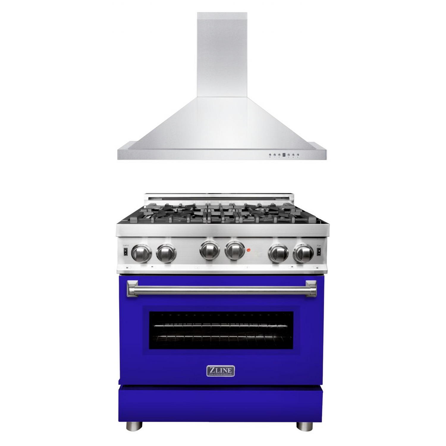ZLINE 30 in. Kitchen Package with Stainless Steel Gas Range with Blue Matte Door and Convertible Vent Range Hood (2KP-RGBMRH30)