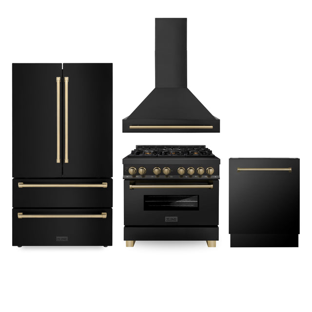 ZLINE 36" Autograph Edition Kitchen Package with Black Stainless Steel Dual Fuel Range, Range Hood, Dishwasher and Refrigeration with Champagne Bronze Accents (4AKPR-RABRHDWV36-CB)