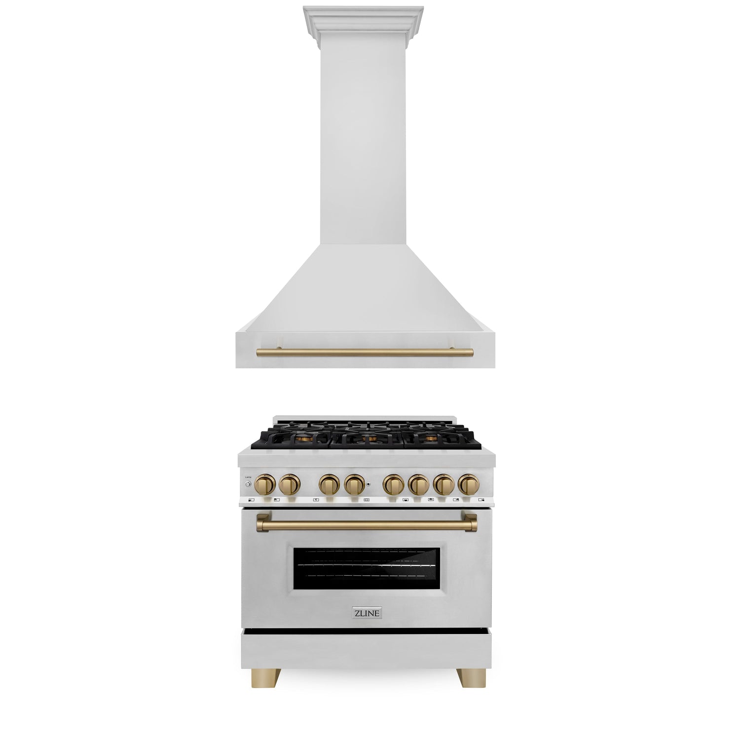Shop Attainable Luxury with the ZLINE Kitchen and Bath Kitchen Appliance Package - featuring ZLINE Autograph Edition 36" 6.0 cu. ft. Dual Fuel Range with Gas Stove and Electric Oven in Stainless Steel with Champagne Bronze Accents (RAZ-36-CB) and 36" Stainless Steel Range Hood with Stainless Steel Shell and Champagne Bronze Handle (8654STZ-36-CB). Save more on your dream kitchen when you bundle. Free shipping on all orders.