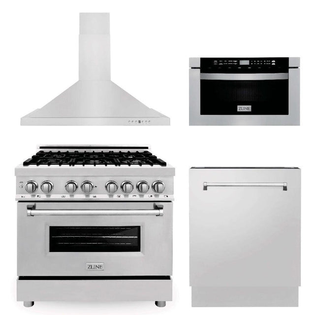 ZLINE 36 in. Kitchen Package with Stainless Steel Dual Fuel Range, Range Hood, Microwave Drawer and Classic Dishwasher (4KP-RARH36-MWDW)