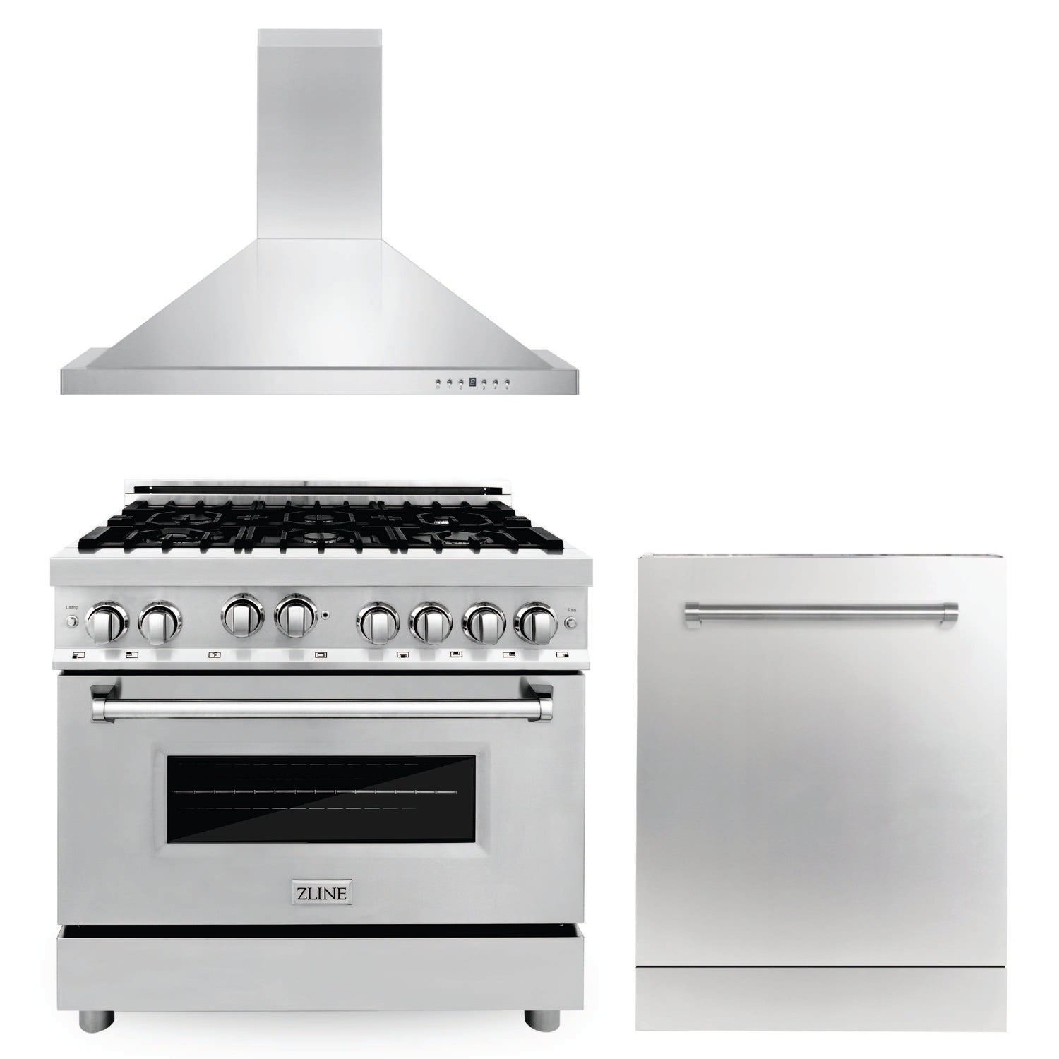 ZLINE 36 in. Kitchen Package with Stainless Steel Gas Range, Convertible Vent Range Hood and Dishwasher (3KP-RGRH36-DW)