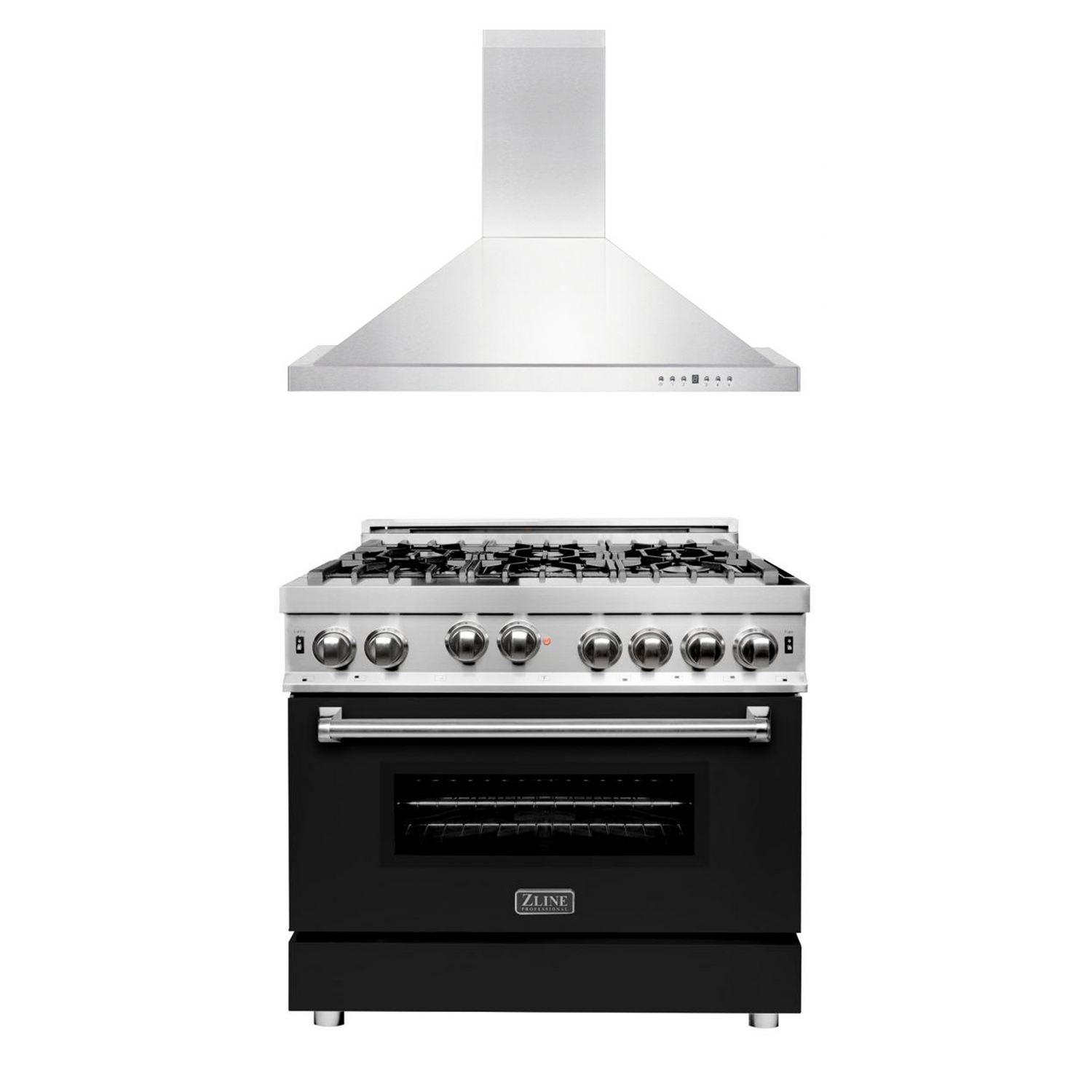 ZLINE 36 in. Kitchen Package with Stainless Steel Gas Range with Black Matte Door and Convertible Vent Range Hood (2KP-RGBLMRH36)
