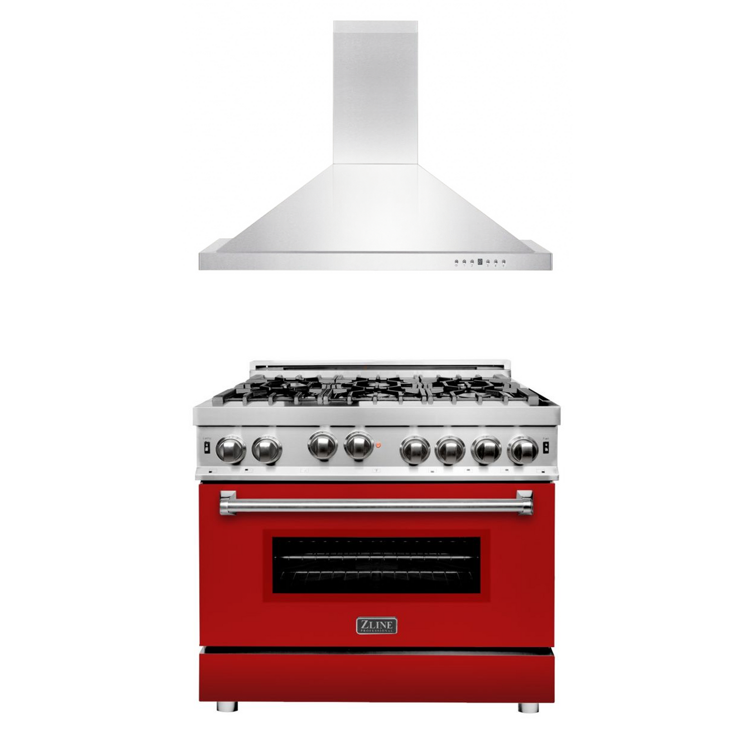 ZLINE 36 in. Kitchen Package with Stainless Steel Gas Range with Red Matte Door and Convertible Vent Range Hood (2KP-RGRMRH36)