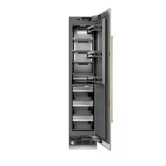 Luxury isn’t meant to be left desired—it’s meant to be attainable. The ZLINE Autograph Edition 18 in. 8.6 cu. ft. Right Hinge Column Freezer in Stainless Steel with Graphite Gray Interior and Champagne Bronze Accents (RCFVRZ-30418-CB) combines the convenience of a sleek integrated tall column built-in design with efficient freezing technology and spacious storage capacity for multiple grocery items. Achieve ZLINE Attainable Luxury® excellence with innovative features designed to enhance your kitchen’s freezing capability.