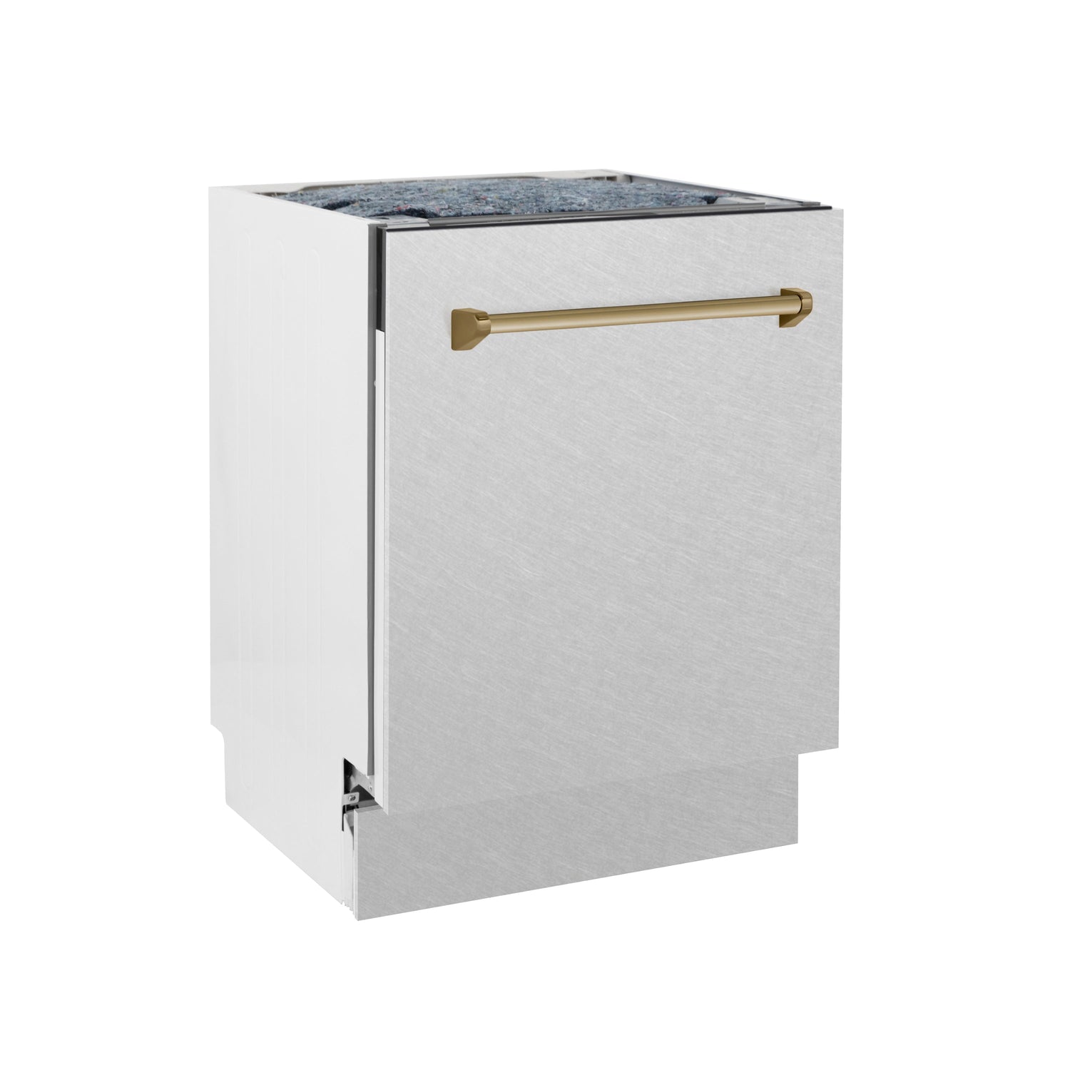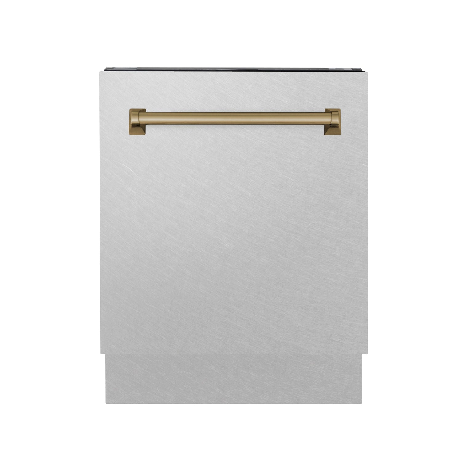 ZLINE Autograph Edition 24 in. Tallac Series 3rd Rack Top Control Built-In Tall Tub Dishwasher with Satin Stainless Steel Panel and Champagne Bronze Handle, 51dBa (DWVZ-SN-24-CB)