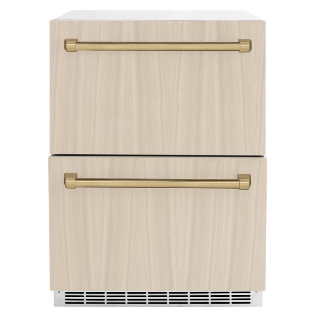 ZLINE Autograph Edition 24 in. Touchstone 168 Can Outdoor-Rated Dual Refrigerator Drawer with Panel-Ready Doors and Champagne Bronze Handles (RDSPOZ-24-CB)