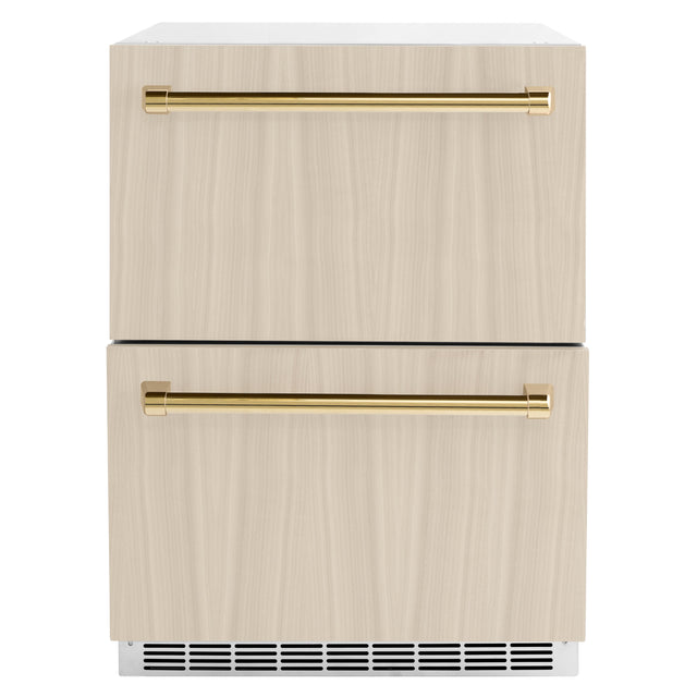 ZLINE Autograph Edition 24 in. Touchstone 168 Can Outdoor-Rated Dual Refrigerator Drawer with Panel-Ready Doors and Polished Gold Handles (RDSPOZ-24-G)