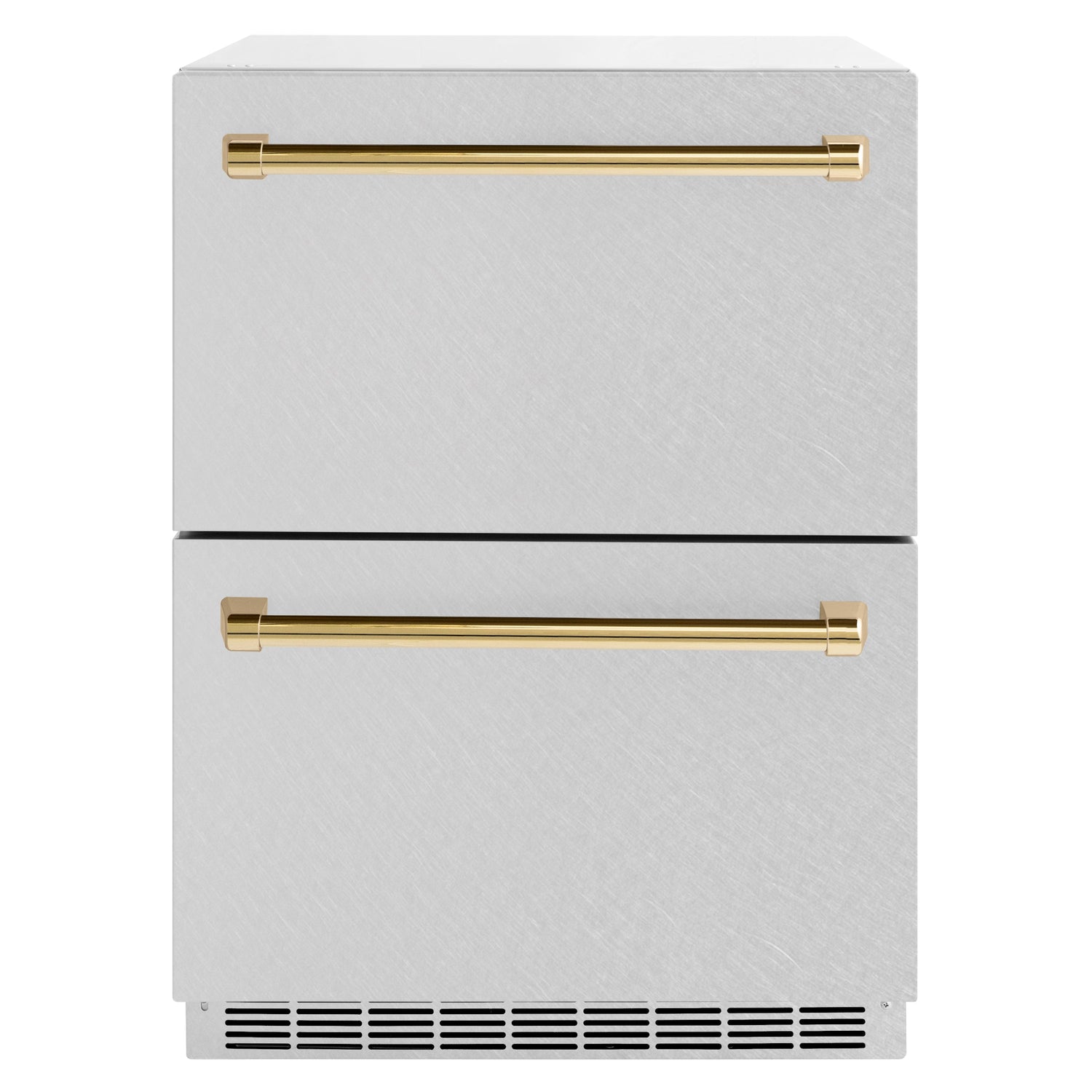 ZLINE Autograph Edition 24 in. Touchstone 168 Can Outdoor-Rated Dual Refrigerator Drawer with Satin Stainless Steel Doors and Polished Gold Handles (RDSOZ-SN-24-G)