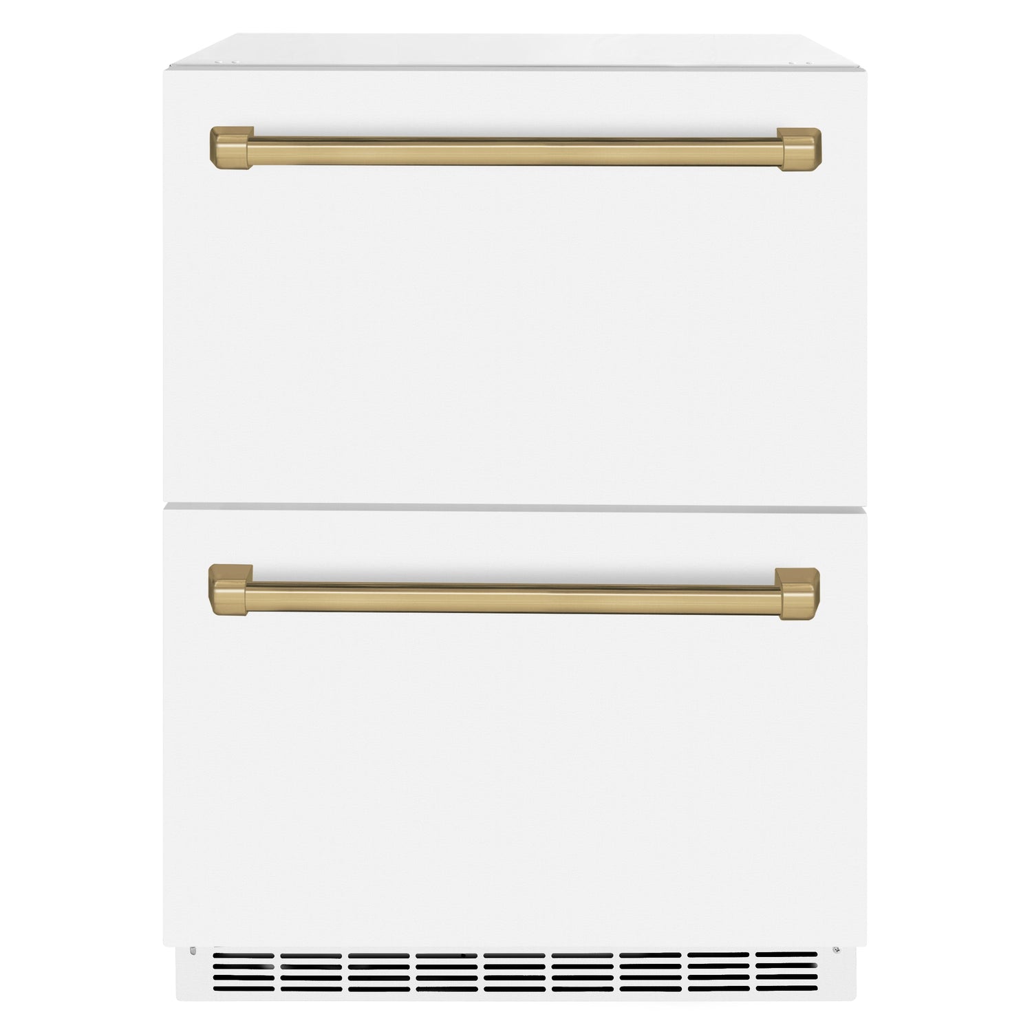 ZLINE Autograph Edition 24 in. Touchstone 168 Can Outdoor-Rated Dual Refrigerator Drawer with White Matte Doors and Champagne Bronze Handles (RDSOZ-WM-24-CB)