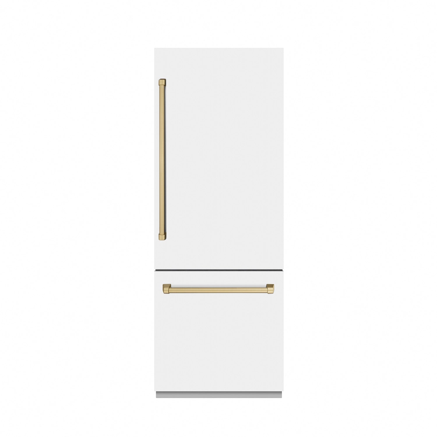 ZLINE Autograph Edition 30 in. 16.1 cu. ft. Built-In Bottom Freezer Refrigerator with Water Dispenser and Ice Maker in White Matte with Graphite Gray Interior and Champagne Bronze Accents (GRBIVZ-WM-30-CB)