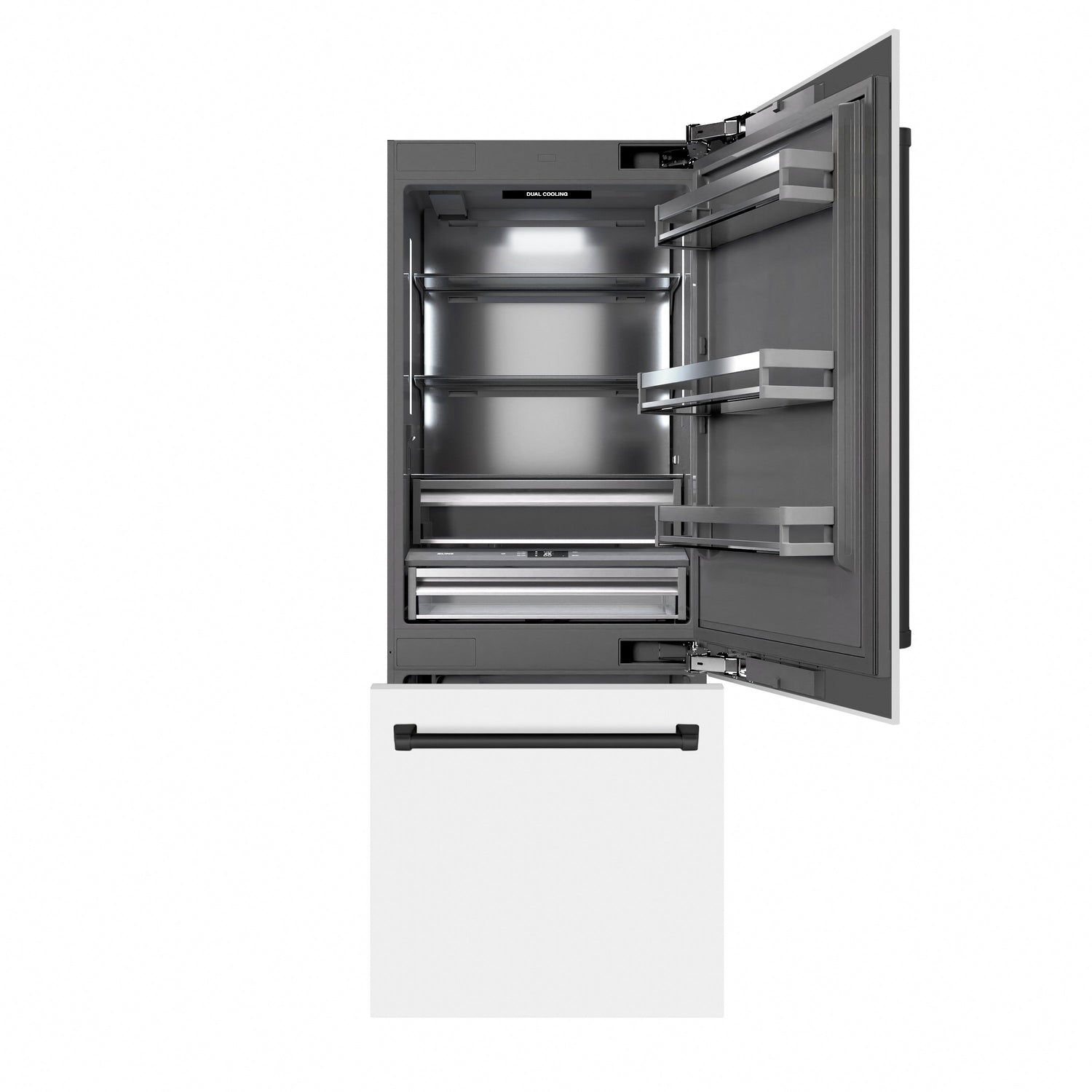 ZLINE Autograph Edition 30 in. 16.1 cu. ft. Built-In Bottom Freezer Refrigerator with Water Dispenser and Ice Maker in White Matte with Graphite Gray Interior and Matte Black Accents (GRBIVZ-WM-30-MB)