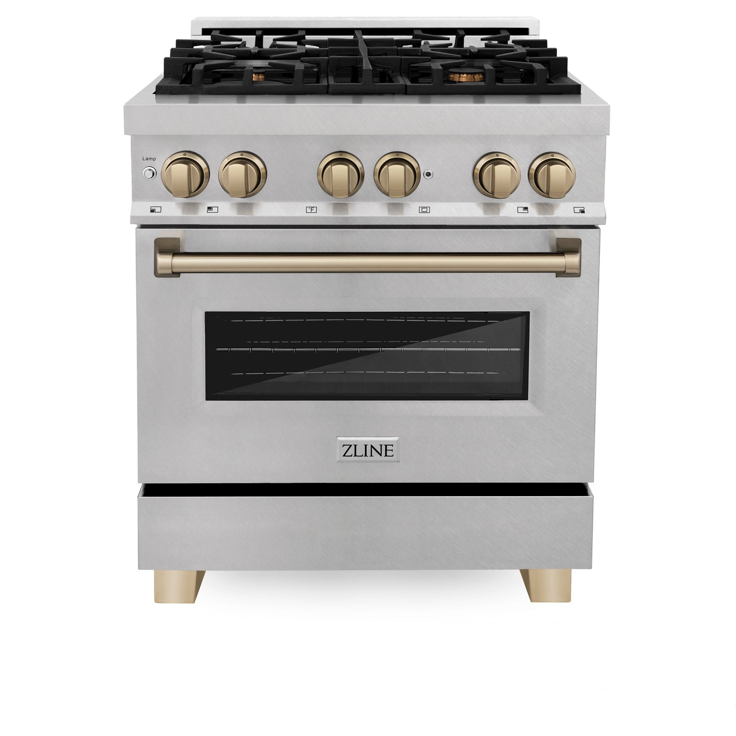 Luxury isn’t meant to be left desired — it’s meant to be attainable. The ZLINE Autograph Edition 30 in. 4.0 cu. ft. Legacy Dual Fuel Range with 4 Burner Gas Cooktop and Electric Convection Oven in Satin Stainless Steel and Champagne Bronze Accents (RASZ-SN-30-CB) pairs a powerful gas cooktop with 4 Italian-crafted burners, an electric convection oven with a Landscape oven door window design, and elegant champagne bronze knobs and handle. With innovative features designed to enhance your kitchen’s capability, ZLINE Legacy Dual Fuel Ranges provide a professional culinary experience by pairing unmatched performance with timeless style.