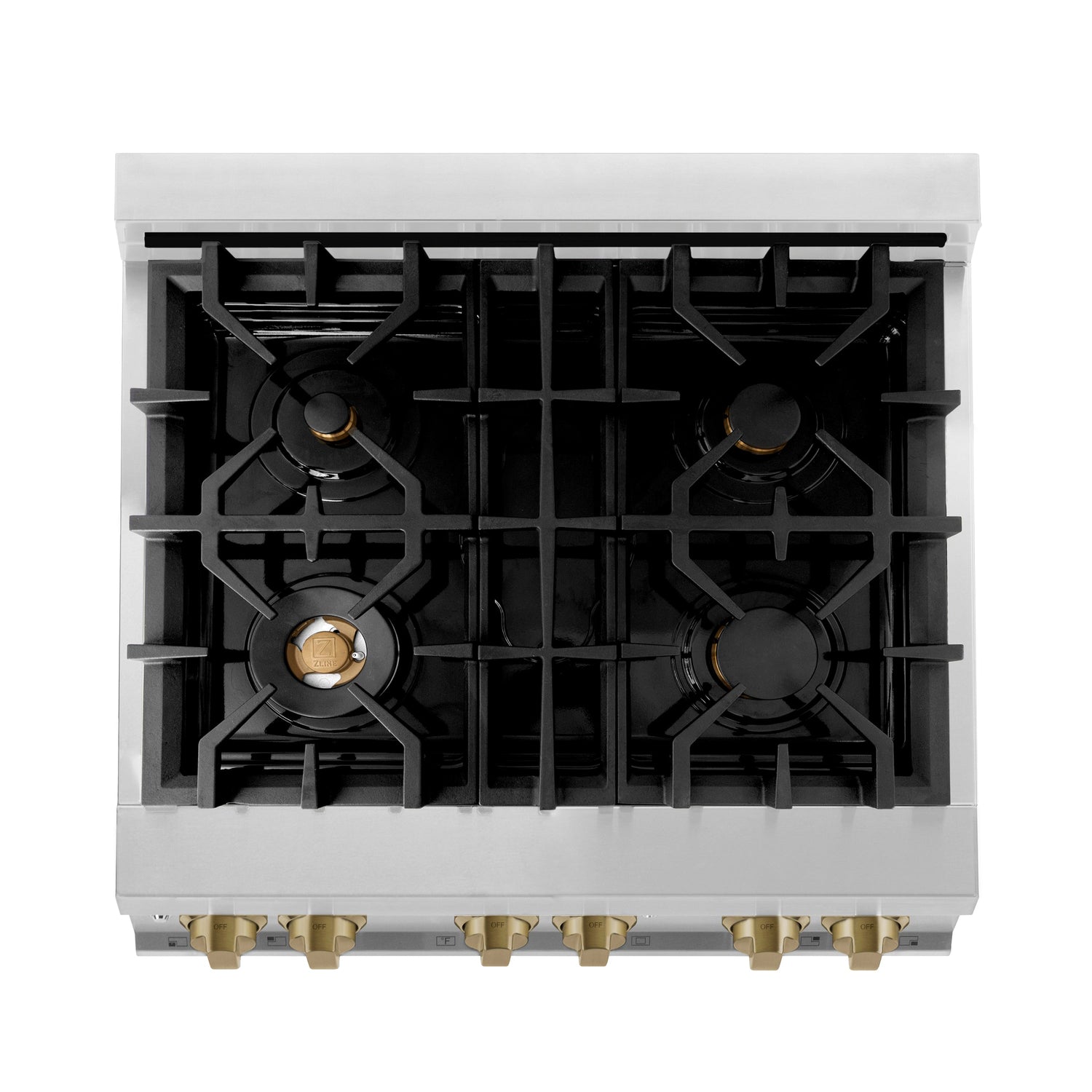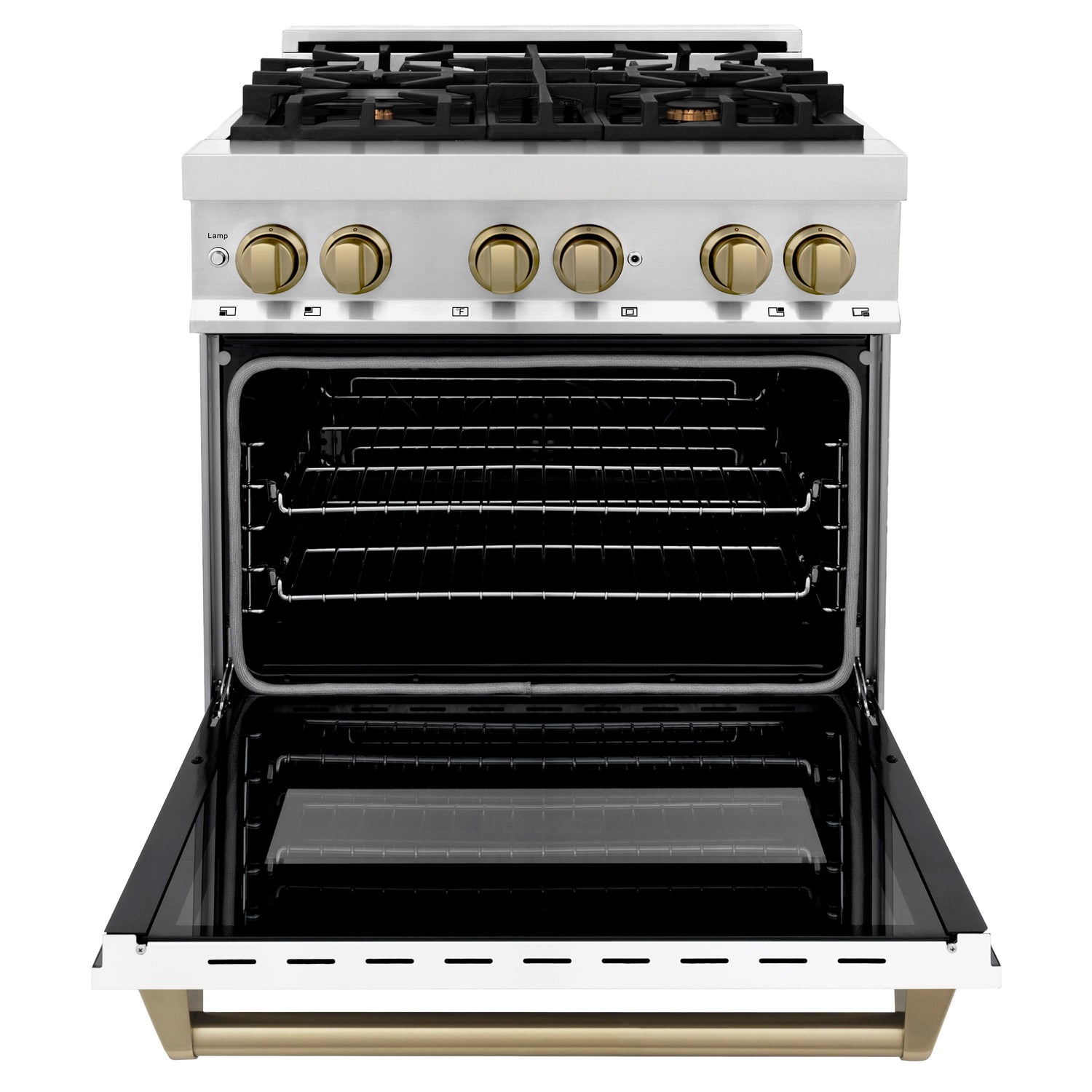 ZLINE Autograph Edition 30 in. 4.0 cu. ft. Legacy Dual Fuel Range with 4 Burner Gas Cooktop and Electric Convection Oven in Stainless Steel with White Matte Door and Champagne Bronze Accents (RAZ-WM-30-CB)