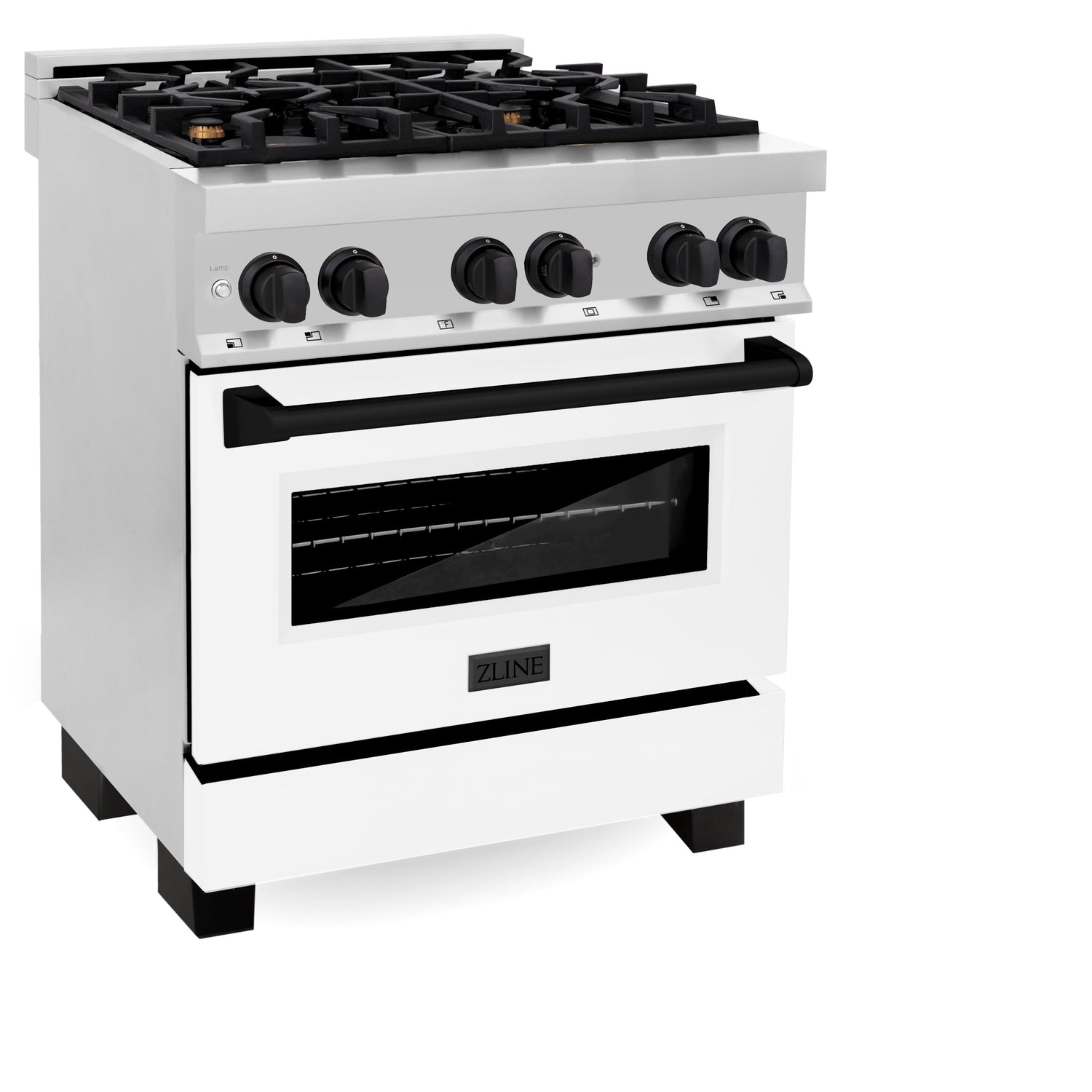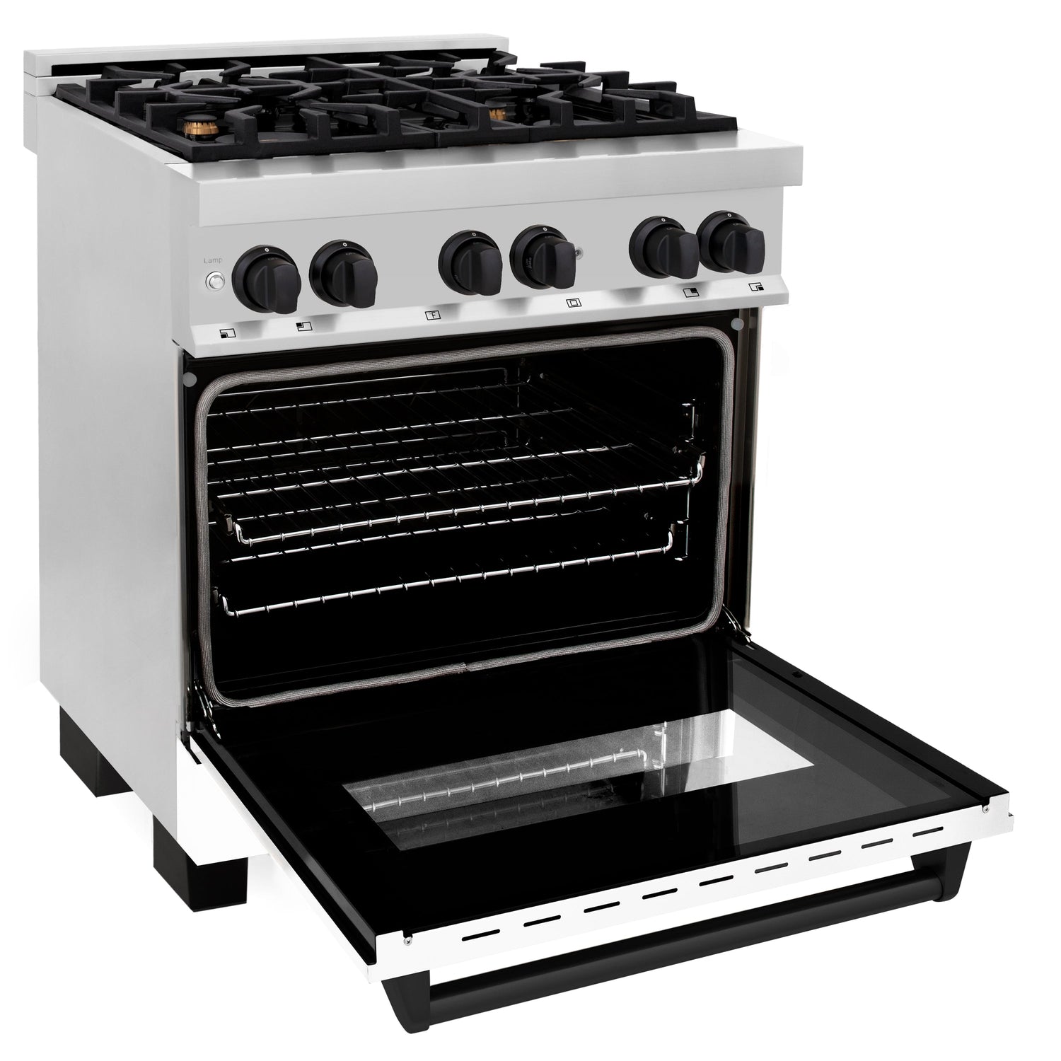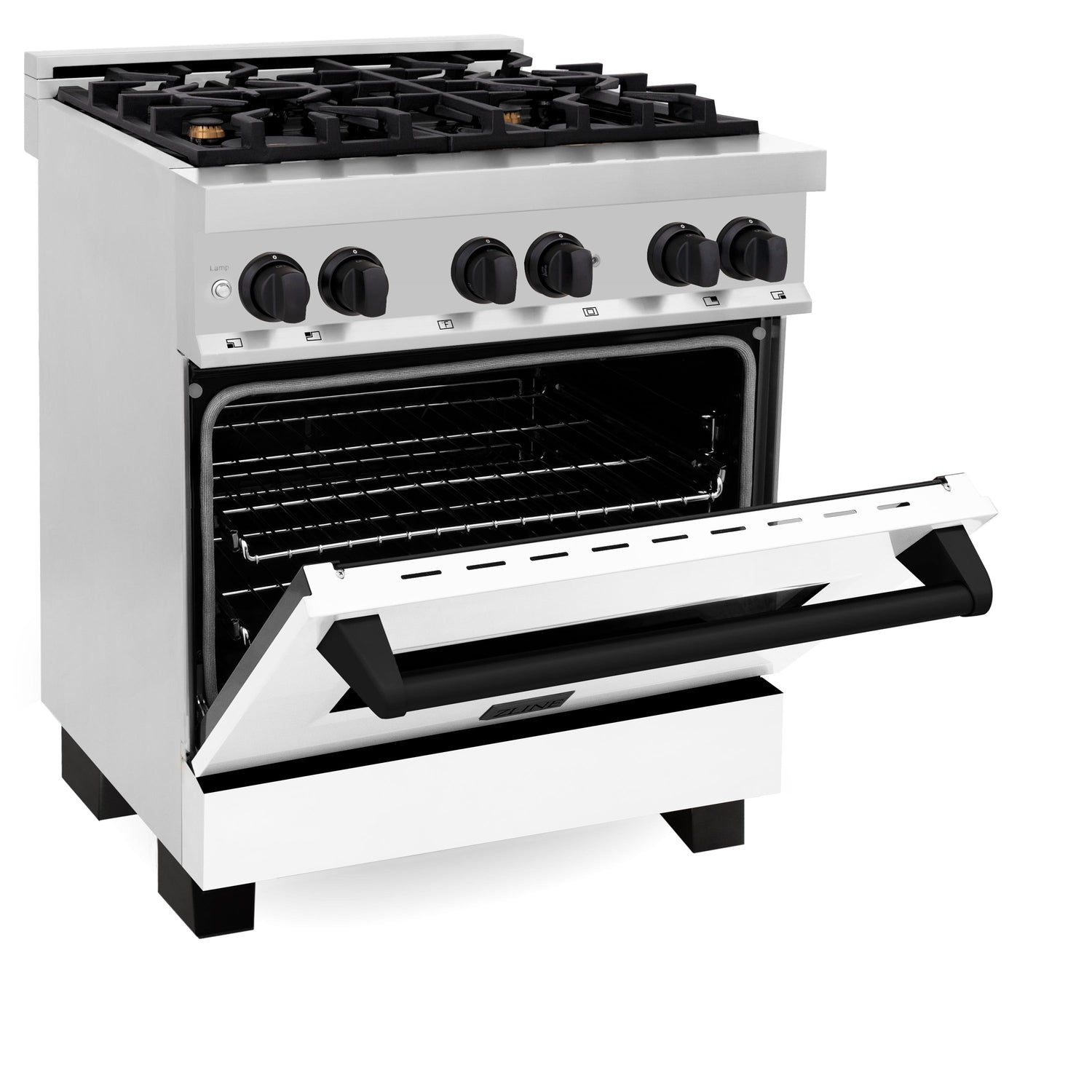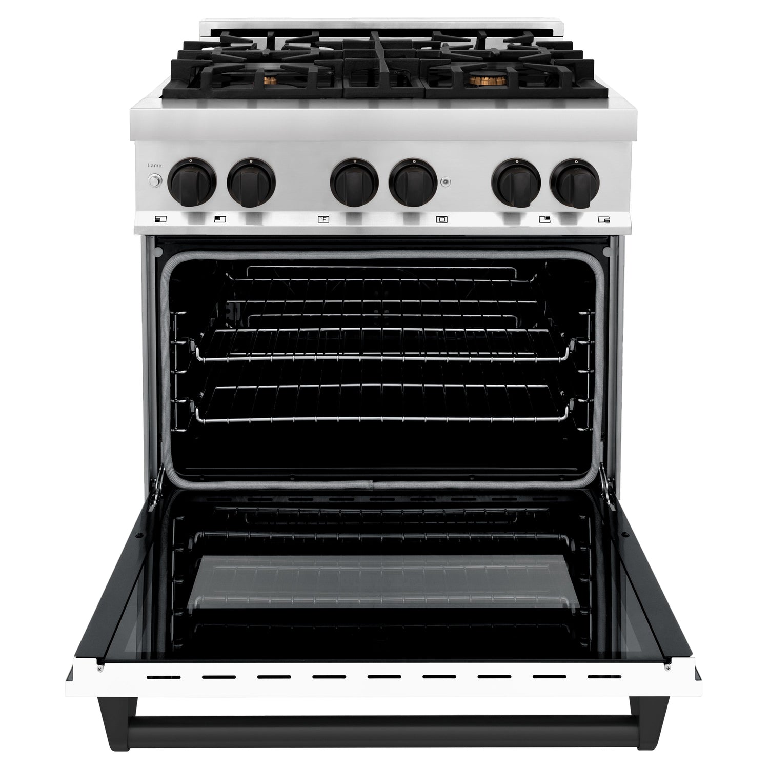 ZLINE Autograph Edition 30 in. 4.0 cu. ft. Legacy Dual Fuel Range with 4 Burner Gas Cooktop and Electric Convection Oven in Stainless Steel with White Matte Door and Matte Black Accents (RAZ-WM-30-MB)
