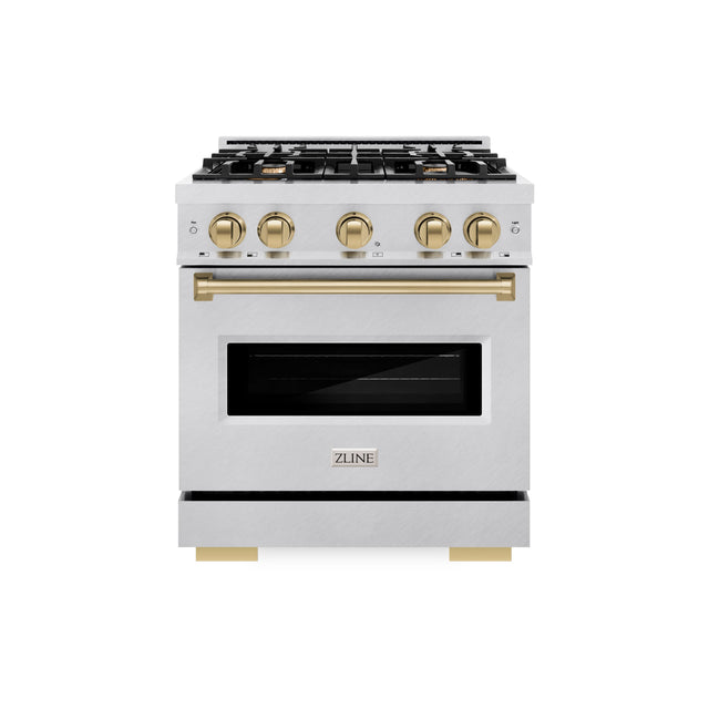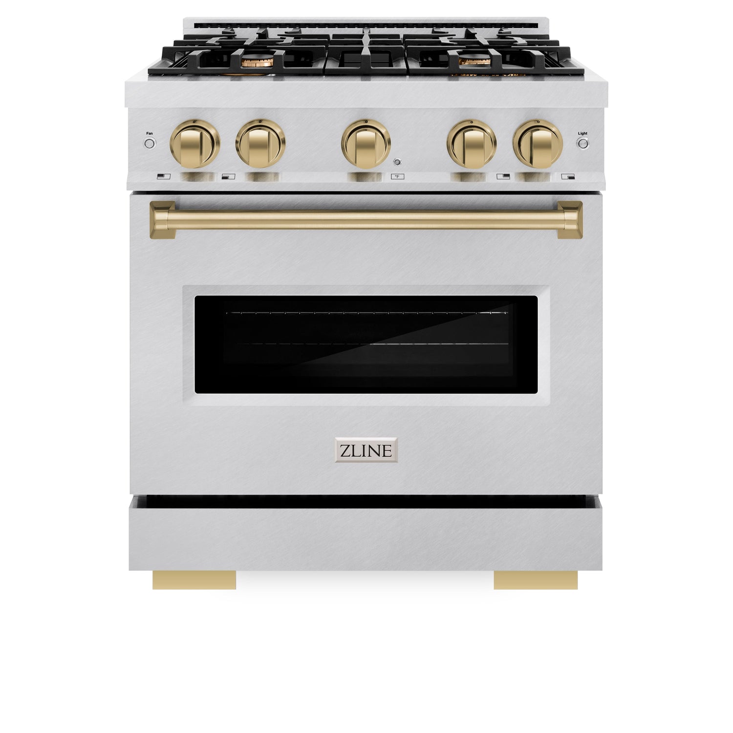 ZLINE Autograph Edition 30 in. 4.2 cu. ft. Classic Dual Fuel Range with 4 Burner Gas Cooktop and Electric Convection Oven in Satin Stainless Steel with Champagne Bronze Accents (CDRSZ-30-CB)