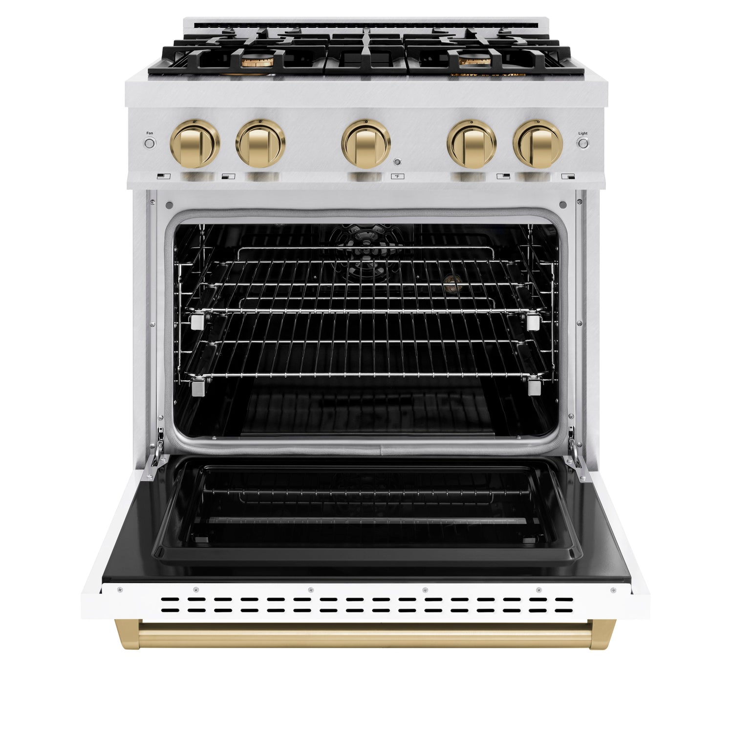 ZLINE Autograph Edition 30 in. 4.2 cu. ft. Classic Dual Fuel Range with 4 Burner Gas Cooktop and Electric Convection Oven in Satin Stainless Steel with White Matte Door and Champagne Bronze Accents (CDRSZ-WM-30-CB)